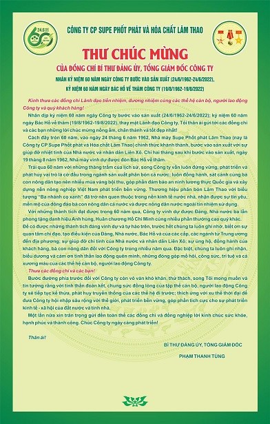 Thư chúc mừng của đồng chí Bí thư Đảng ủy, Tổng Giám đốc Công ty Phạm Thanh Tùng