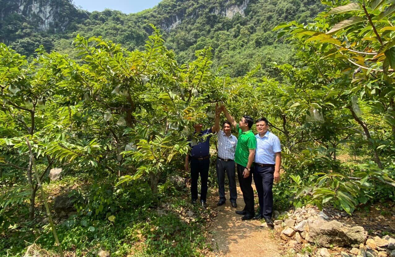 Anh Đinh Quốc Hùng, cán bộ thị trường Supe Lâm Thao cùng đại diện Lãnh đạo xã Y Tịch tham quan vườn na của gia đình anh Hà Văn Hiền. Ảnh: T/g