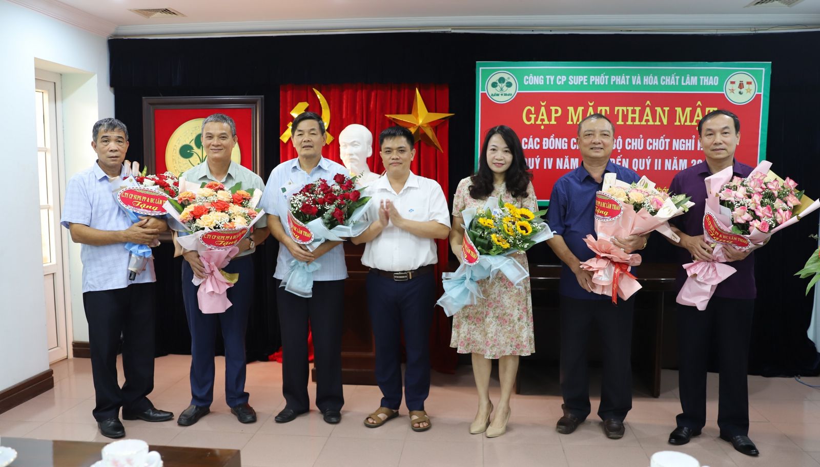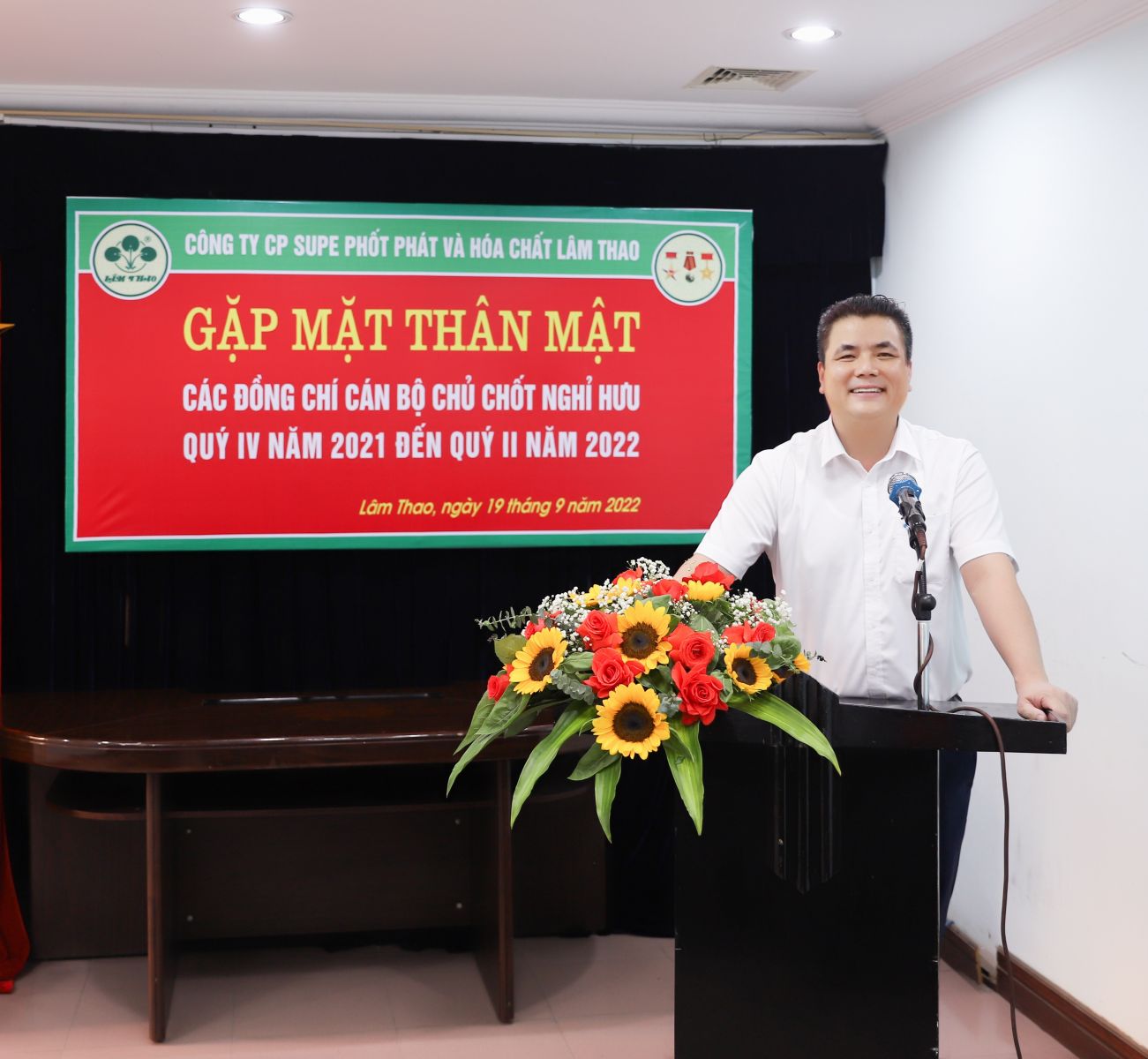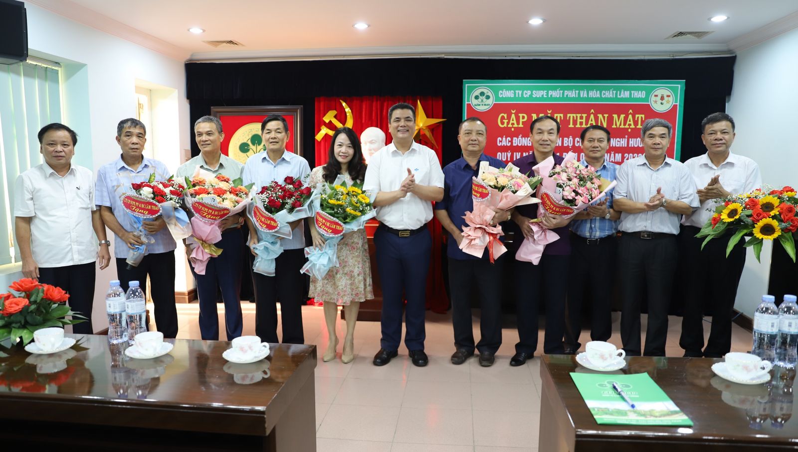 Chiều ngày 19/9/2022, Công ty CP Supe Phốt phát và Hóa chất Lâm Thao tổ chức gặp mặt thân mật các đồng chí cán bộ chủ chốt: Phan Anh Hùng, nguyên Trợ lý Tổng Giám đốc, phụ trách Phòng Kinh doanh; Dương Quốc Hùng, nguyên Trưởng phòng Xây dựng cơ bản; Nguyễn Tuấn Anh, nguyên Giám đốc Xí nghiệp Cấp thoát Nước; Vũ Trung Dũng, nguyên Giám đốc Xí nghiệp NPK 3; Lê Thị Thu, nguyên Phó Phòng Tài chính Kế toán; Nguyễn Văn Hiển, nguyên Phó phòng Bảo vệ về nghỉ hưu theo chế độ Nhà nước.