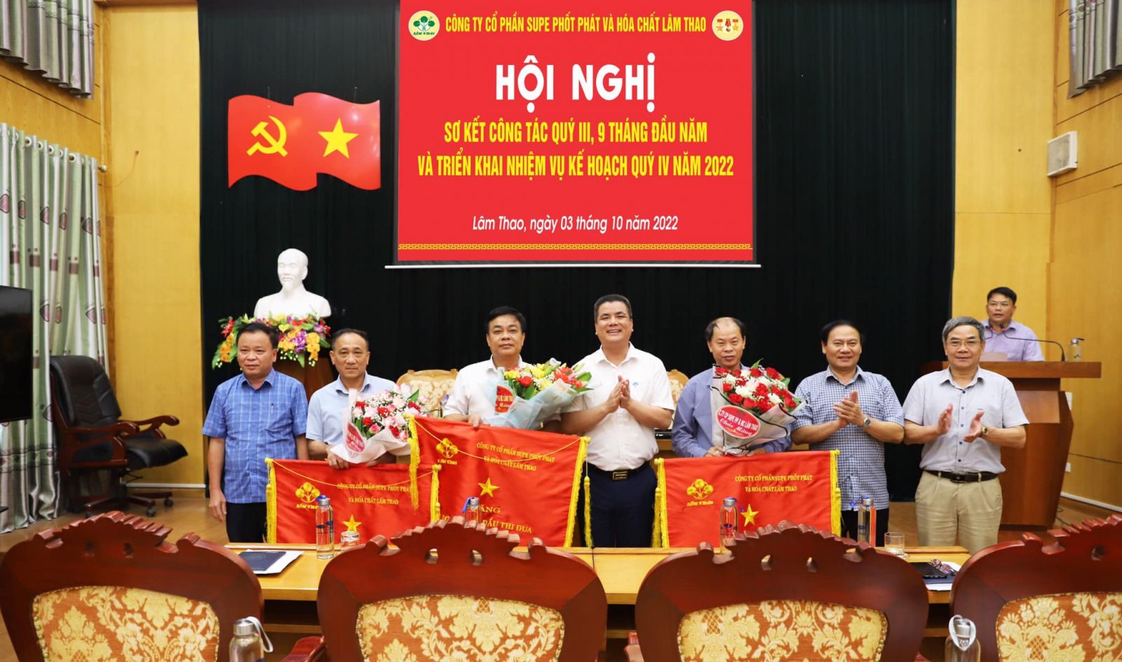 Tại Hội nghị, để ghi nhận những cố gắng, nỗ lực và đóng góp của các đơn vị trong quý III/2022, đồng chí Phạm Thanh Tùng, Bí thư Đảng ủy, Tổng Giám đốc, Chủ tịch Hội đồng Thi đua khen thưởng Công ty đã trao tặng Cờ đơn vị dẫn đầu thi đua cho các đơn vị: Xí nghiệp A xít, Phòng Quản lý chất lượng, Phòng Kế hoạch Vật tư. Biểu dương các đơn vị: Xí nghiệp Supe số 1, Supe số 2, Phòng Tổ chức Lao động, Phòng Tài chính-Kế toán, Phòng Y tế.