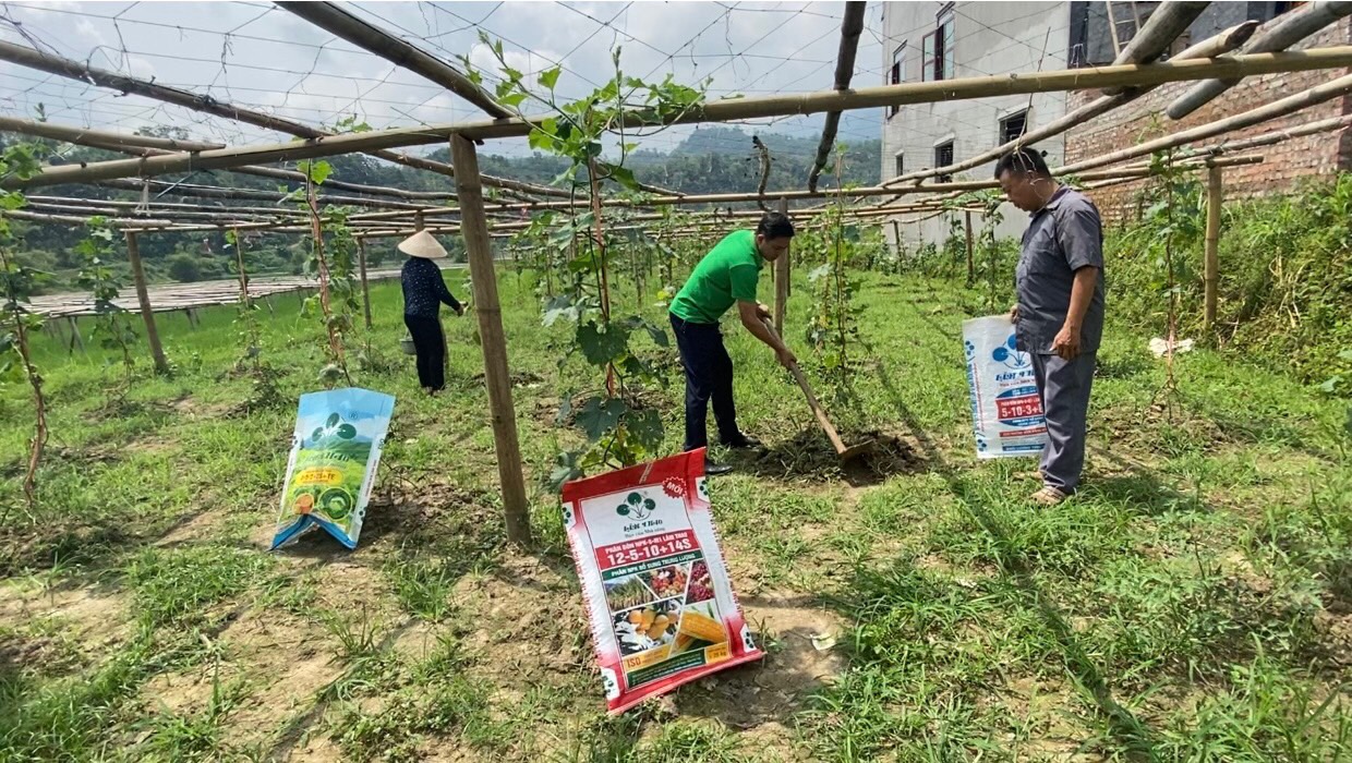Cán bộ thị trường của Supe Lâm Thao hướng dẫn bà con nông dân xã Địa Linh bón phân cho bí xanh thơm. Ảnh:T/g
