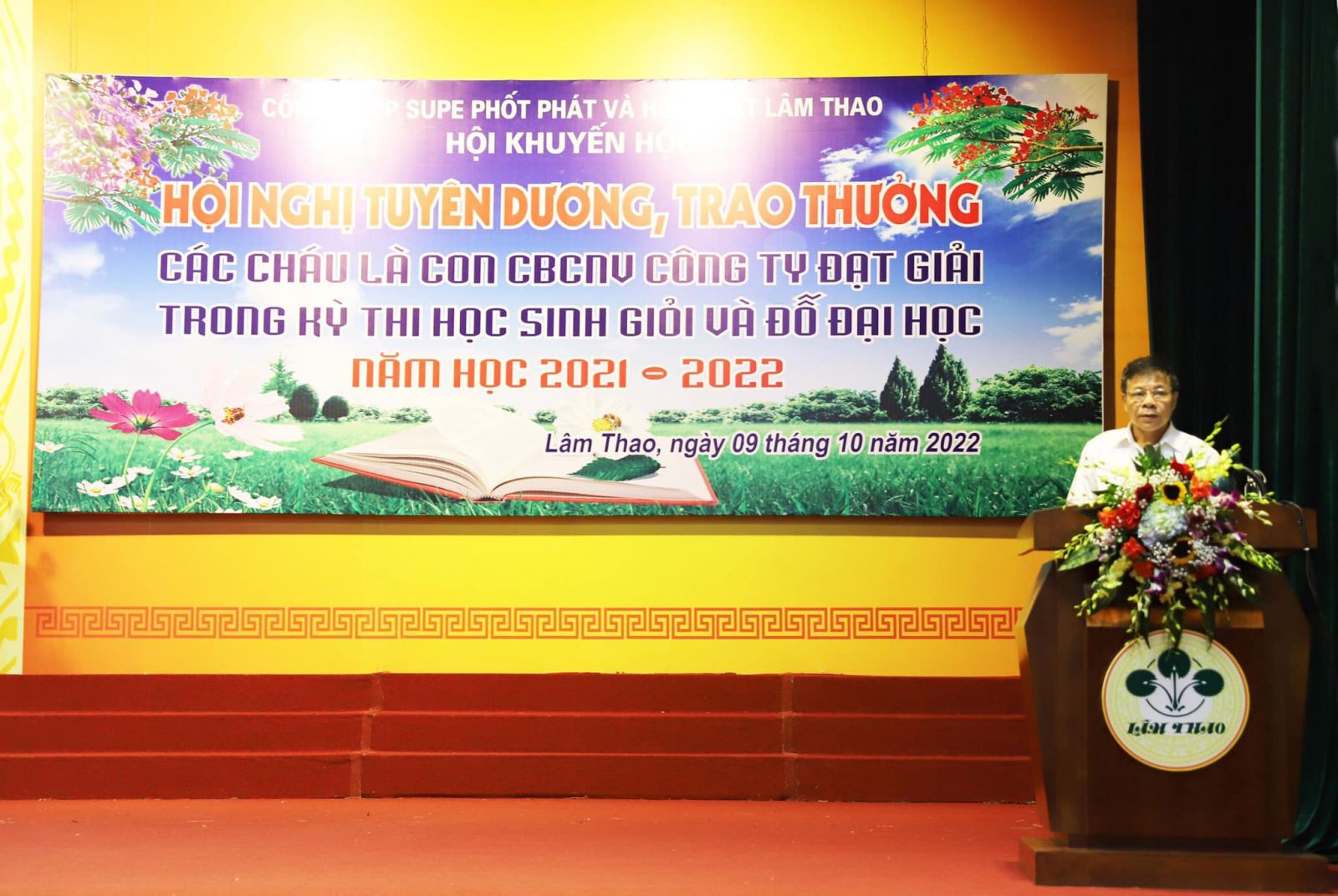 Tại Hội nghị, đồng chí Hồ Thị Mai Hương- Phó Chủ tịch Công đoàn Công nghiệp Hóa chất Việt Nam và đồng chí Hoàng Viết Dũng, Phó Bí thư Đảng ủy Công ty phát biểu chúc mừng, biểu dương các cháu đạt học sinh giỏi các cấp năm học 2021 - 2022 và thi đỗ vào các trường Đại học năm 2022, mong muốn các cháu tiếp tục phát huy kết quả đã đạt được để học tập tốt hơn trong các năm học tiếp theo, xứng đáng là con ngoan, trò giỏi, chủ nhân tương lai của đất nước. Các gia đình tiếp tục động viên, tạo điều kiện để các cháu học tập tốt hơn nữa trong các năm học tới. Đồng chí Phó Chủ tịch Công đoàn Công nghiệp HCVN đề nghị Công ty tiếp tục quan tâm làm tốt hơn nữa công tác khuyến học, khuyến tài tạo động lực thúc đẩy phong trào khuyến học của Công ty ngày càng phát triển.