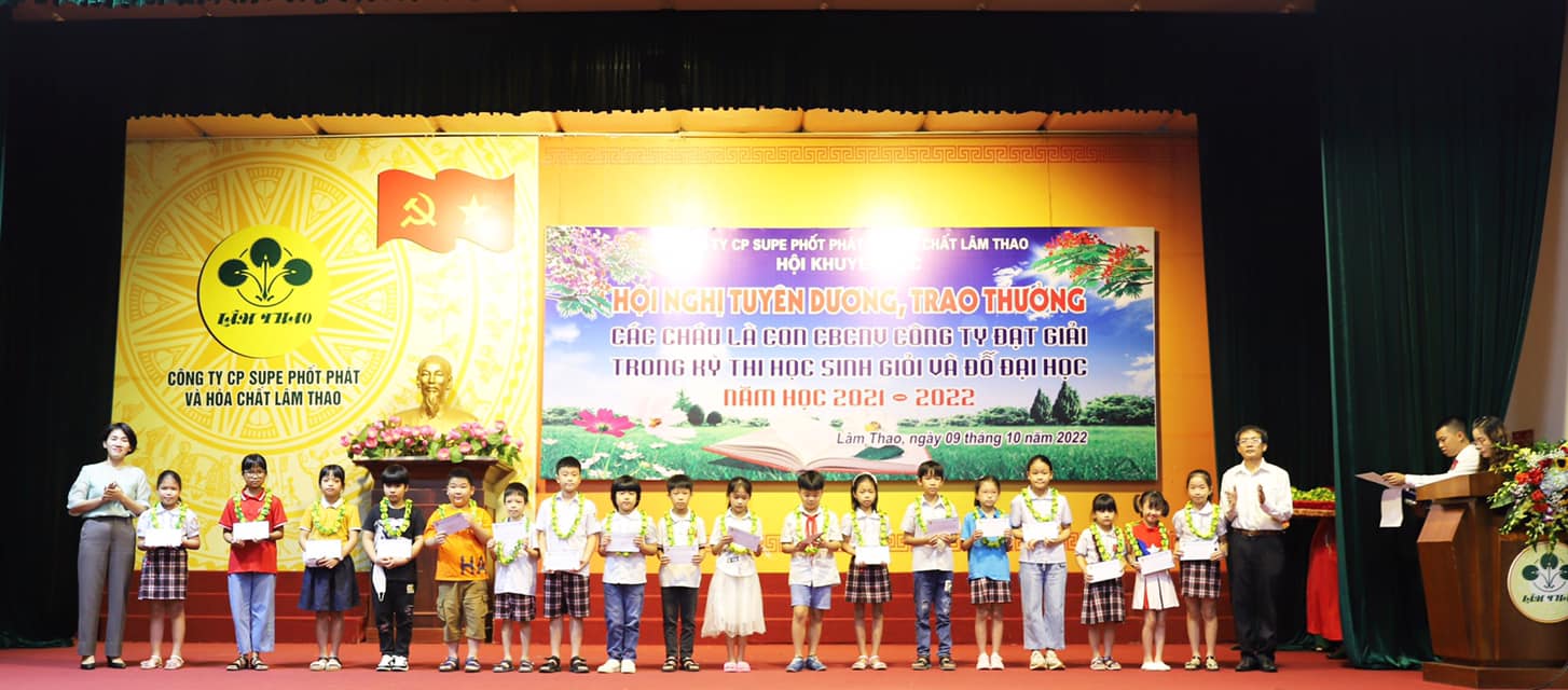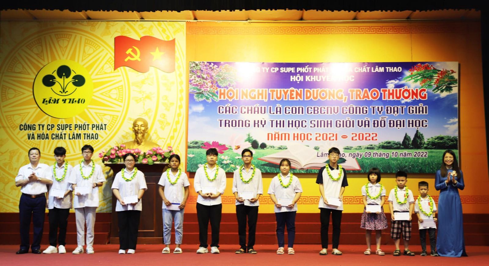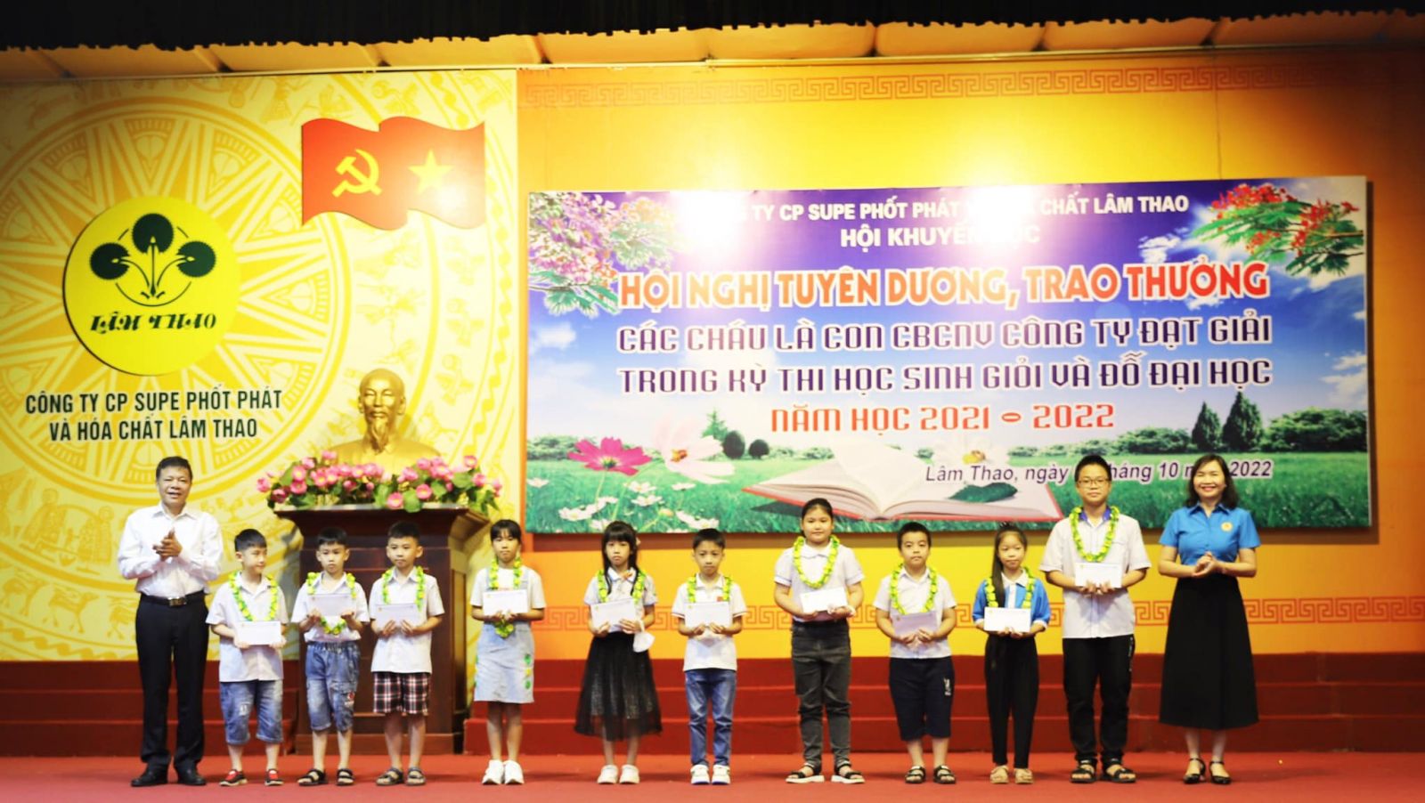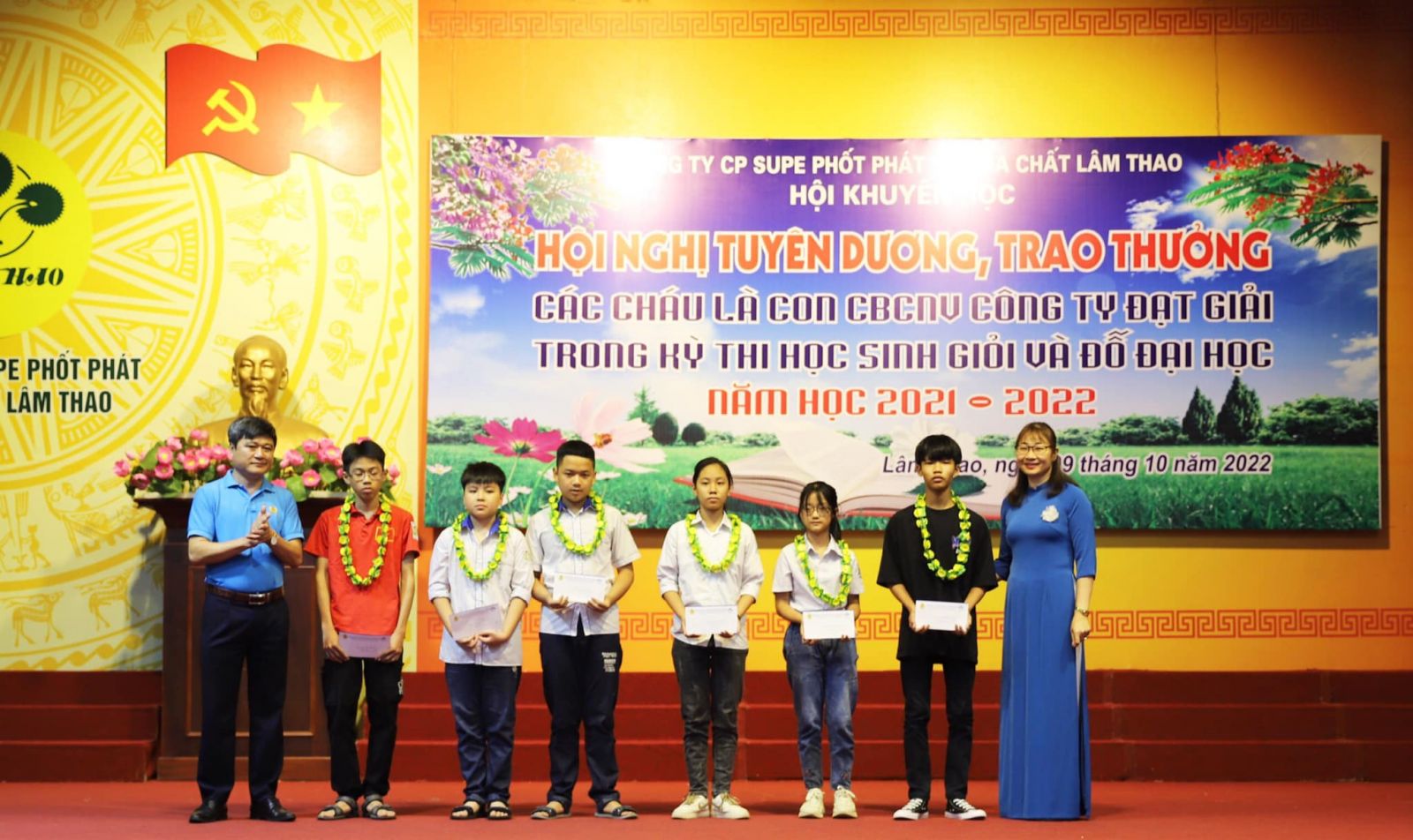 Sáng ngày 9/10/2022, Công ty CP Supe Phốt phát và Hóa chất Lâm Thao tổ chức Hội nghị Tuyên dương, trao thưởng của Công đoàn Công nghiệp Hóa chất Việt Nam và của Công ty cho con CB người lao động trong Công ty đạt học sinh giỏi các cấp năm học 2021- 2022 và trúng tuyển vào Đại học năm 2022.