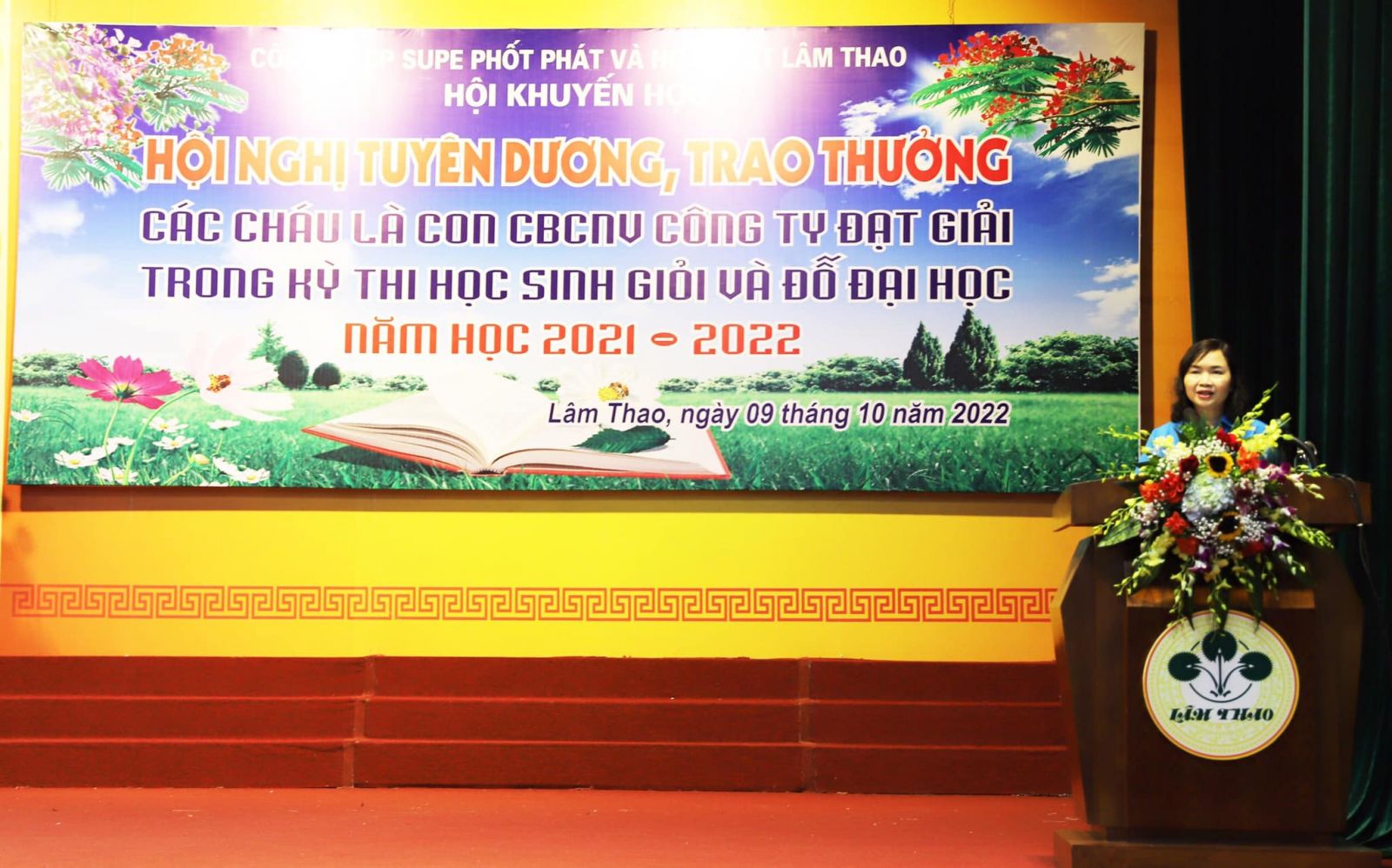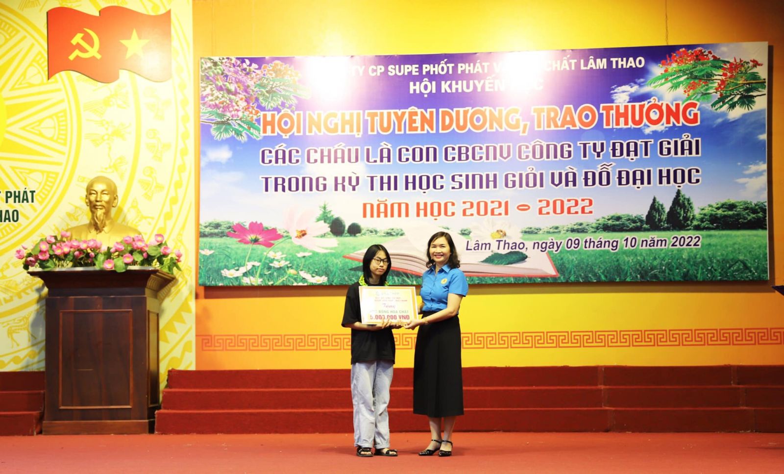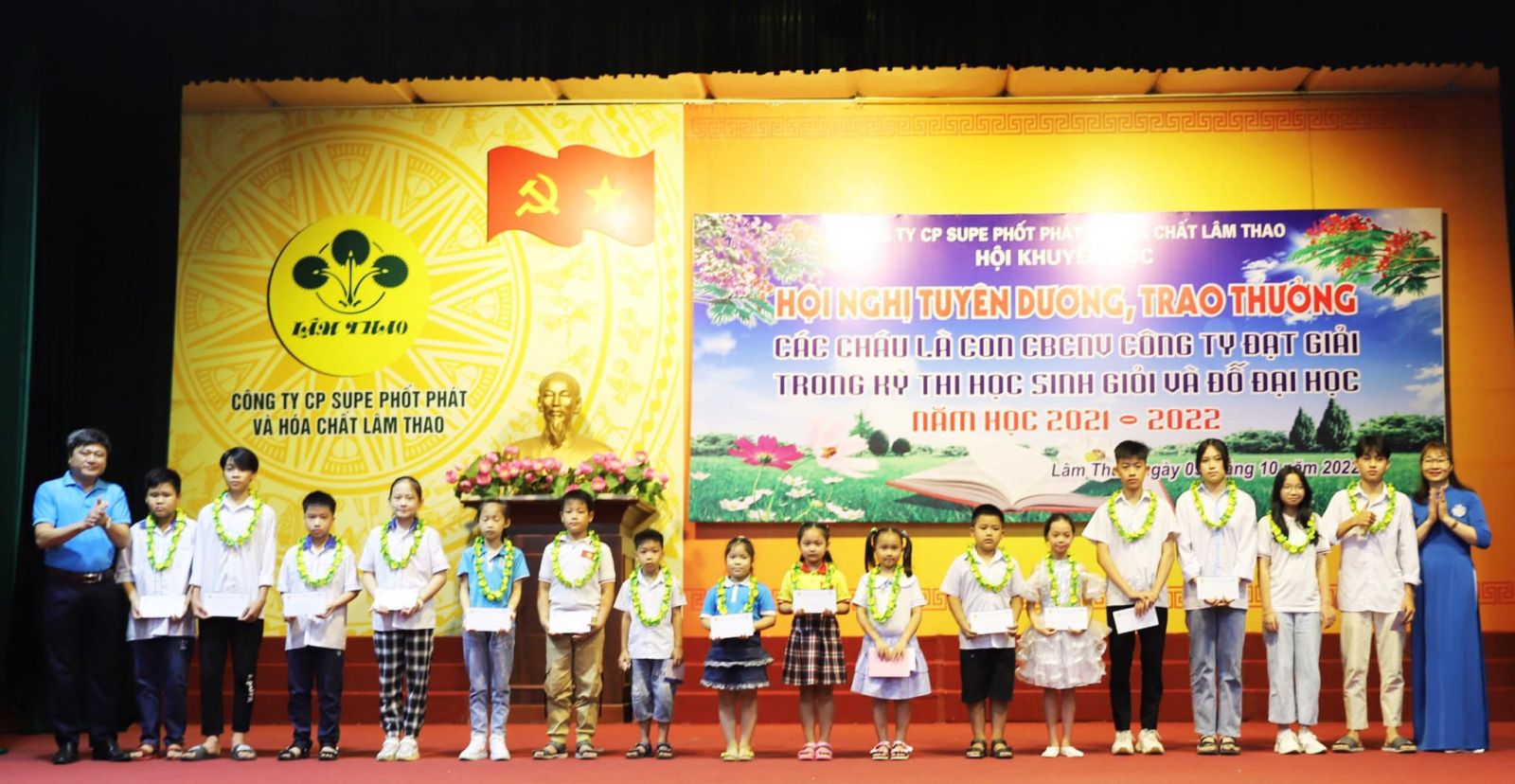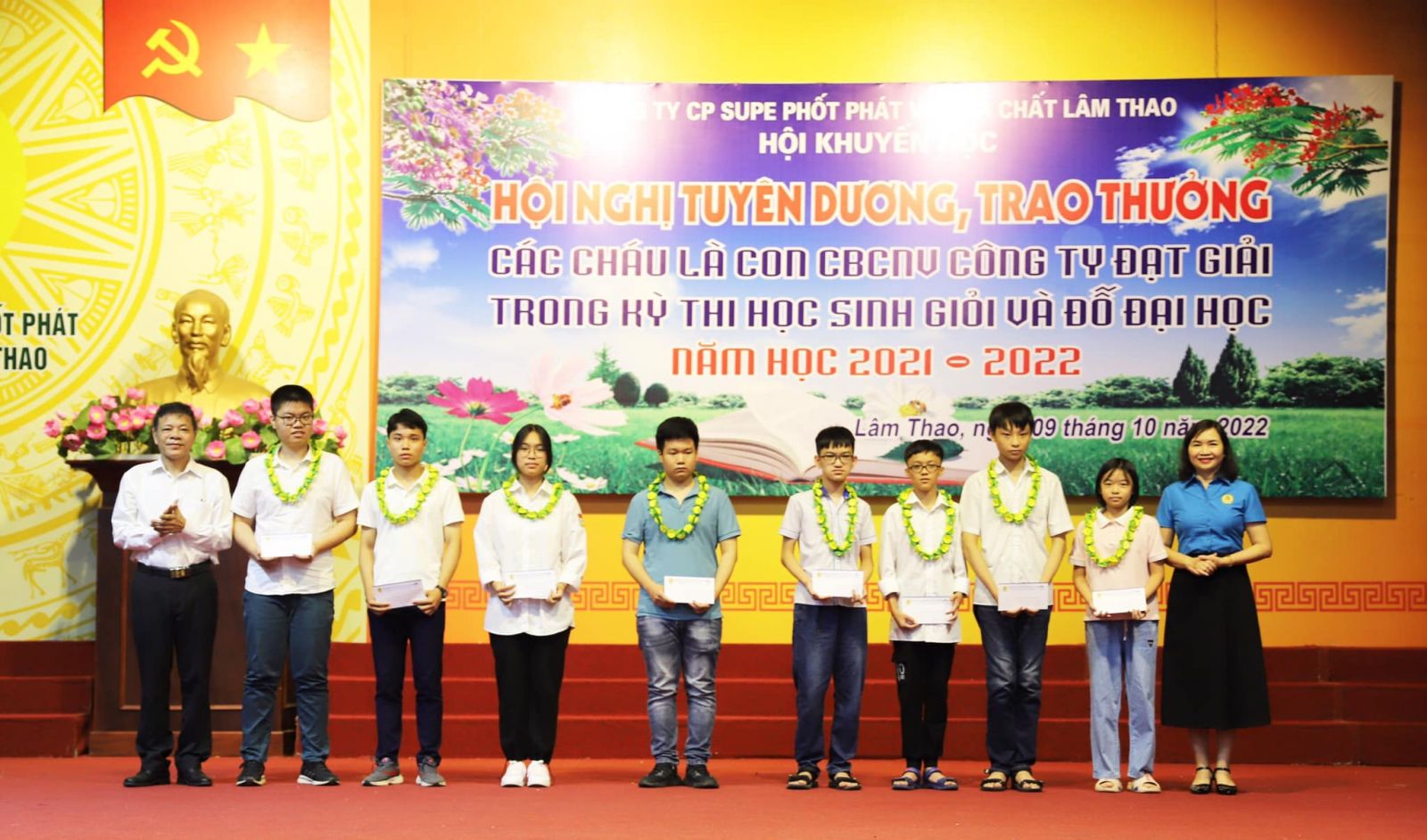 Sáng ngày 9/10/2022, Công ty CP Supe Phốt phát và Hóa chất Lâm Thao tổ chức Hội nghị Tuyên dương, trao thưởng của Công đoàn Công nghiệp Hóa chất Việt Nam và của Công ty cho con CB người lao động trong Công ty đạt học sinh giỏi các cấp năm học 2021- 2022 và trúng tuyển vào Đại học năm 2022.