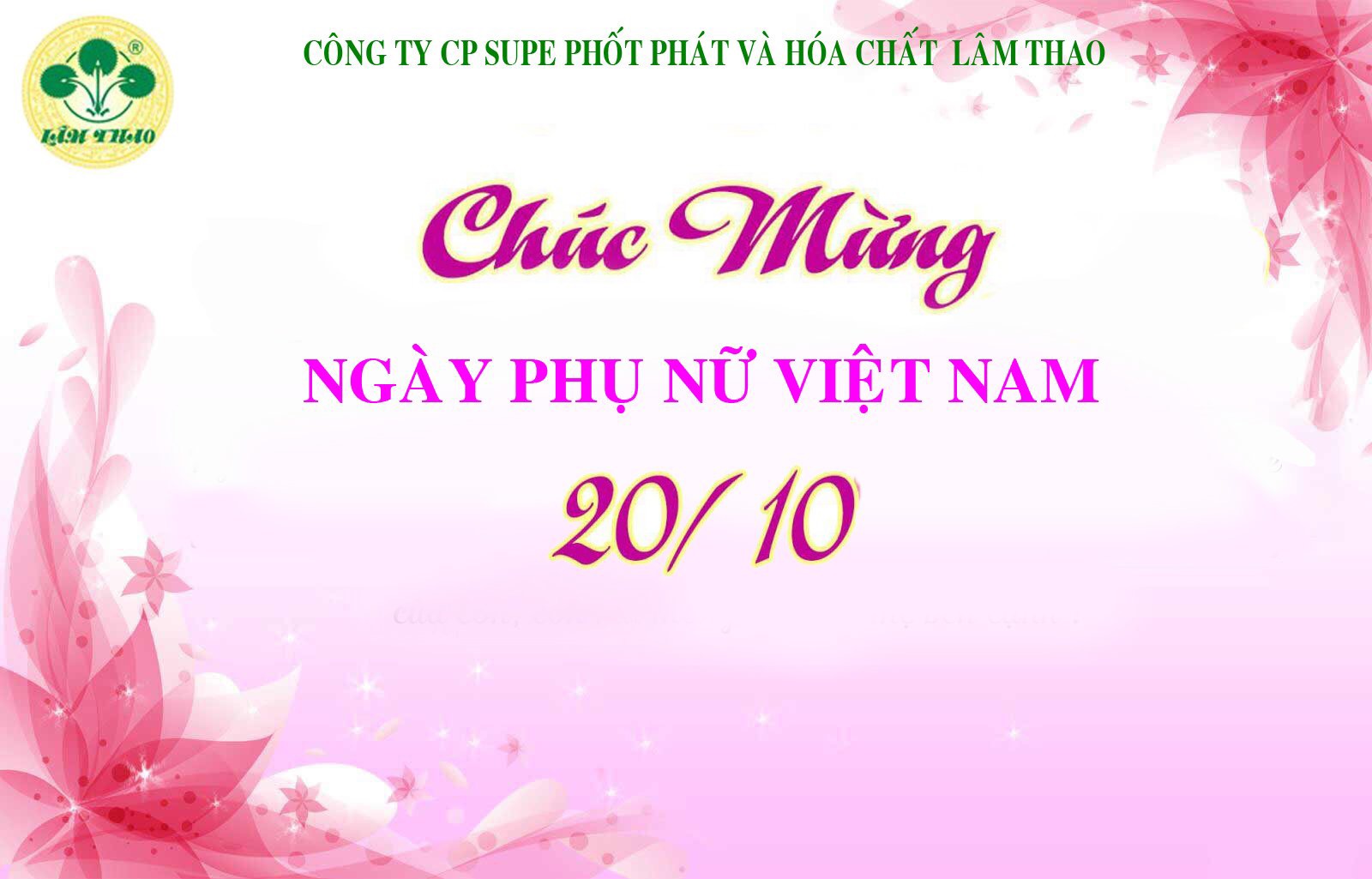 Nhân ngày Phụ nữ Việt Nam 20/10, Ban Lãnh đạo cùng tập thể Anh Em cán bộ, công nhân Công ty cổ phần Supe Phốt phát và Hoá chất Lâm Thao xin gửi lời chúc tới toàn thể Chị Em nữ cán bộ, công nhân Công ty cùng các Mẹ, các Chị là hậu phương của Anh Em luôn dồi dào sức khỏe, trẻ đẹp, hạnh phúc, thành công trong cuộc sống và luôn gắn bó, đồng hành cùng Supe Lâm Thao trên bước đường phát triển.