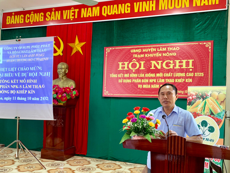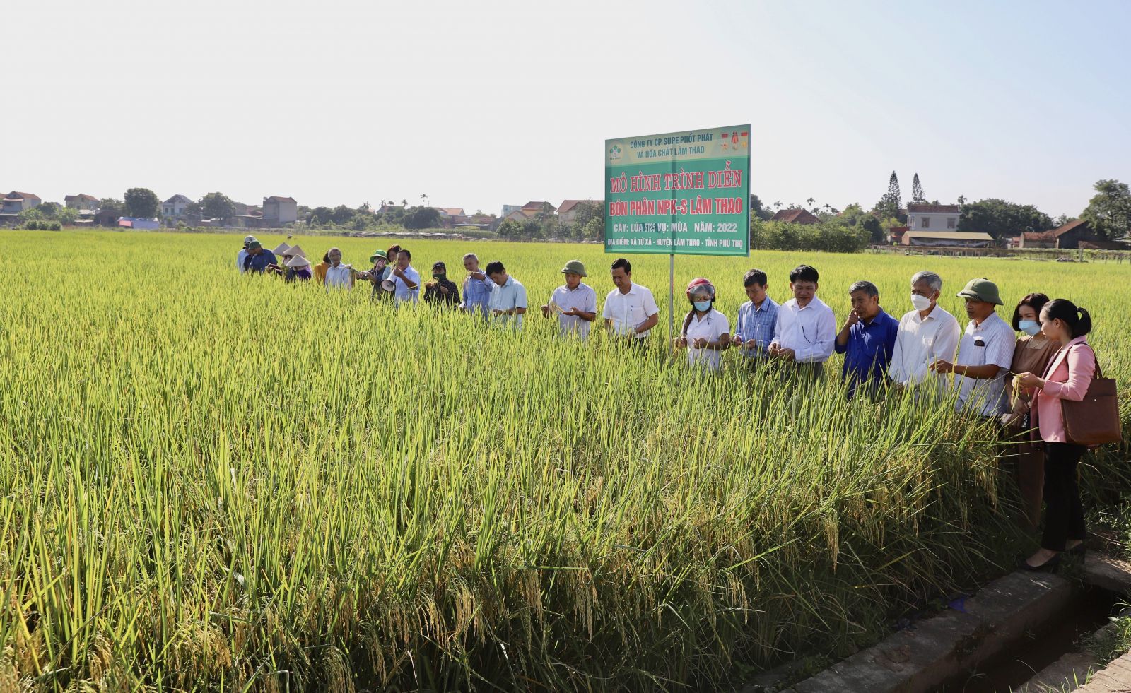 Vừa qua, Công ty CP Supe Phốt phát và Hóa chất Lâm Thao phối hợp với Trạm Khuyến nông huyện Lâm Thao tổ chức tổng kết mô hình sử dụng phân bón Lâm Thao khép kín trên lúa giống mới chất lượng cao ST25 trong vụ mùa 2022 tại khu Đồng Màu, Hợp tác xã dịch vụ và điện năng Thạch Vỹ, xã Tứ Xã.