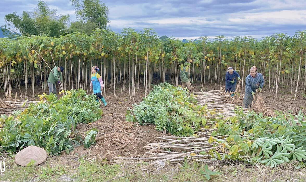 Nông dân thị trấn Hòa Thuận, huyện Quảng Hòa, tỉnh Cao Bằng phấn khởi thu hoạch sắn. Ảnh: t/g