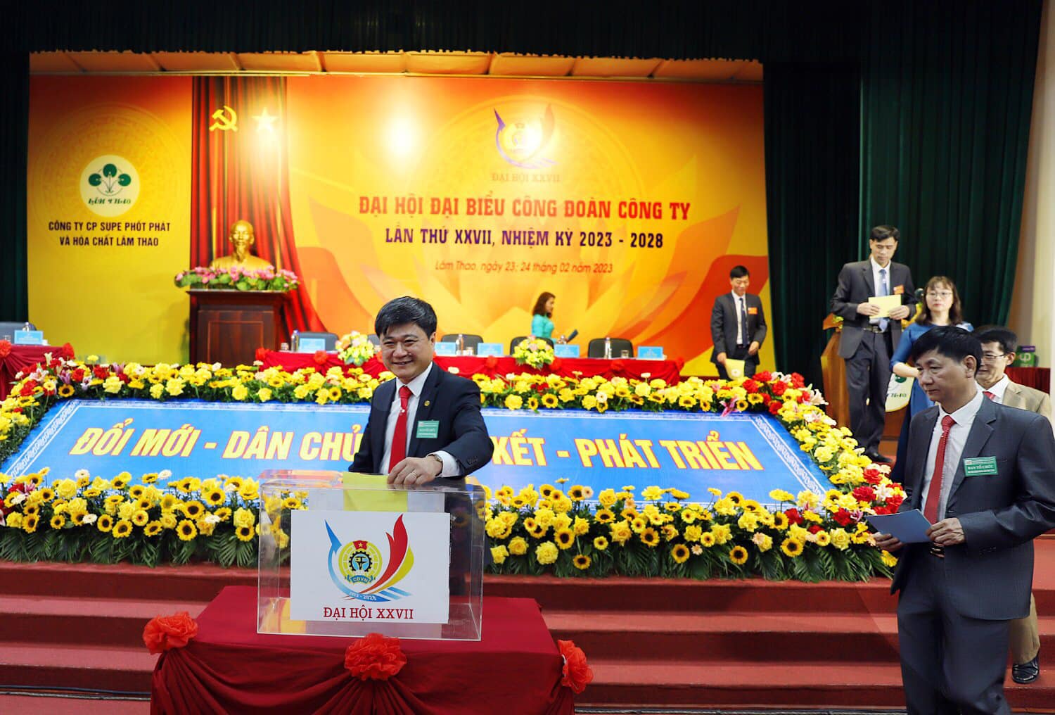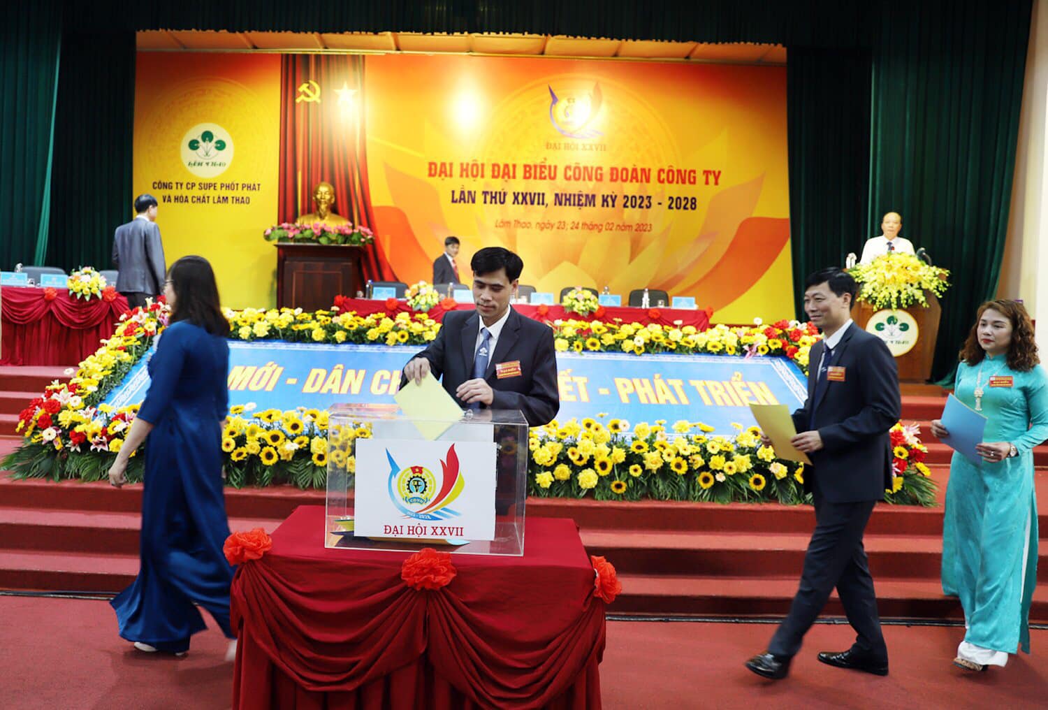 Trên tinh thần dân chủ, Đại hội đã bầu Ban chấp hành Công đoàn Công ty khóa mới gồm 15 đồng chí và bầu đoàn đại biểu đi dự Đại hội XI Công đoàn Công nghiệp Hóa chất Việt Nam, nhiệm kỳ 2023-2028 gồm 08 đại biểu chính thức và 01 đại biểu dự khuyết. Ban chấp hành Công đoàn Công ty khóa mới đã họp phiên thứ nhất và bầu 05 đồng chí vào Ban Thường vụ Công đoàn Công ty; Đồng chí Lê Văn Hoằng, được các đại biểu tín nhiệm bầu tái giữ chức Chủ tịch Công đoàn Công ty, nhiệm kỳ 2023 – 2028; đồng thời bầu ra Ủy Ban kiểm tra khóa XXVII, nhiệm kỳ 2023 - 2028 gồm 03 đồng chí.
