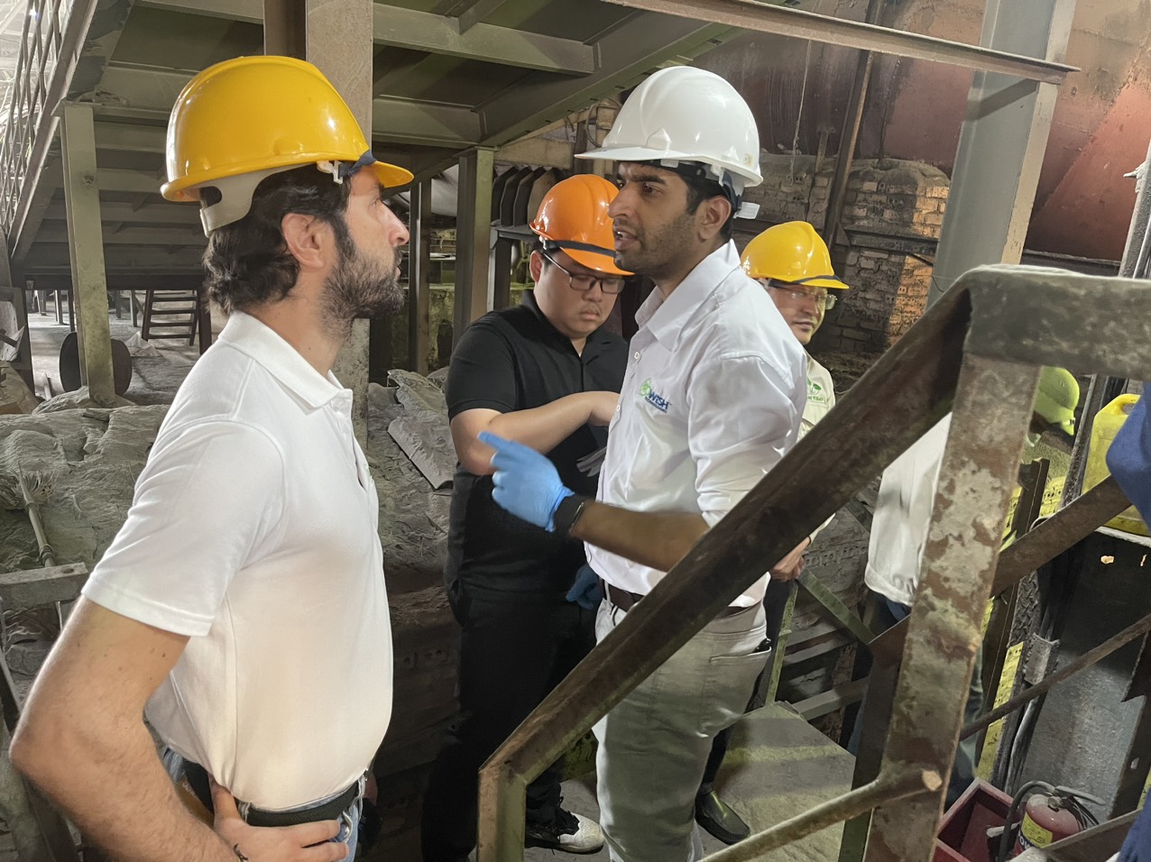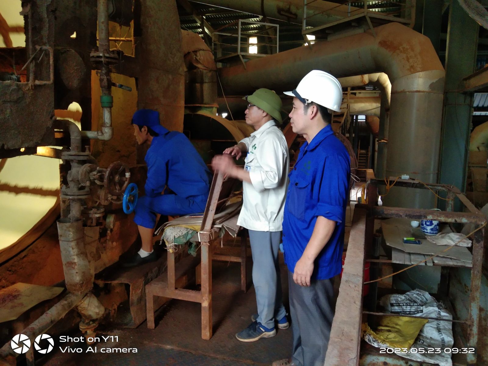 Cán bộ kỹ thuật cùng công nhân theo dõi vận hành thiết bị thùng quay trong sản xuất phân bón NPK-S*M1 Lâm Thao 12-5-10+14S