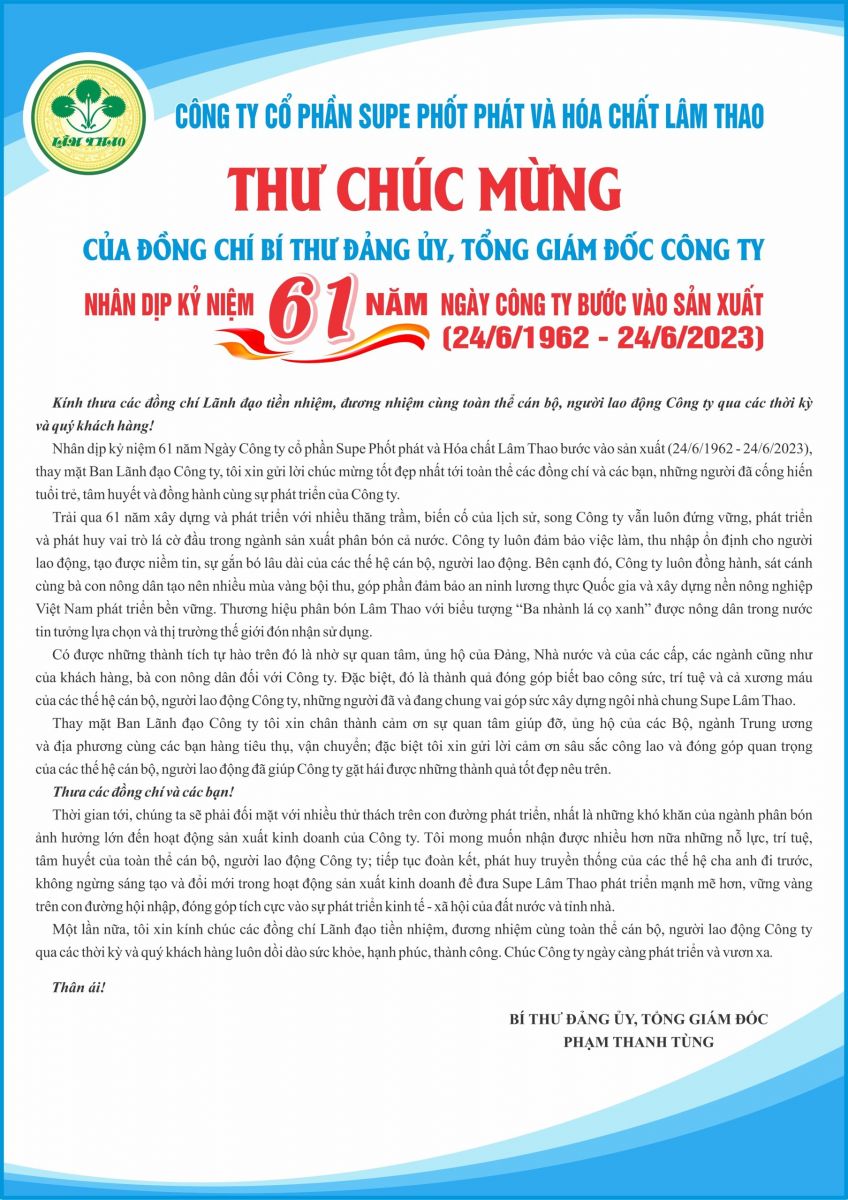 Trang tin Supe Lâm Thao trân trọng giới thiệu toàn văn Thư chúc mừng của đồng chí Phạm Thanh Tùng, Bí thư Đảng ủy, Tổng Giám đốc Công ty.
