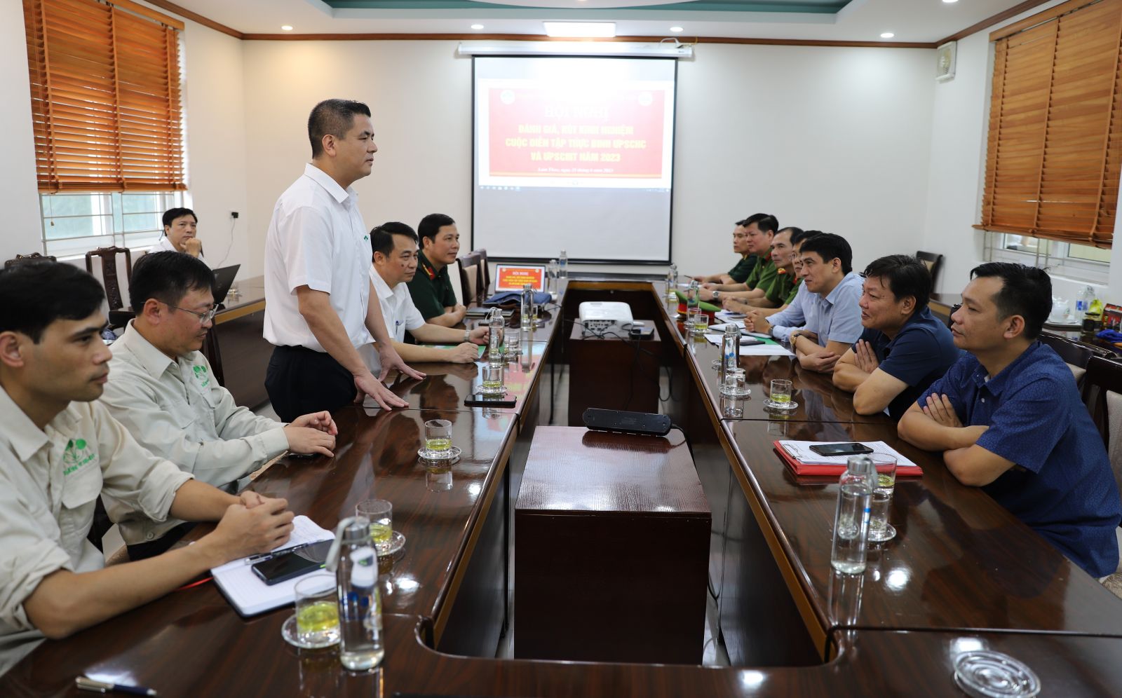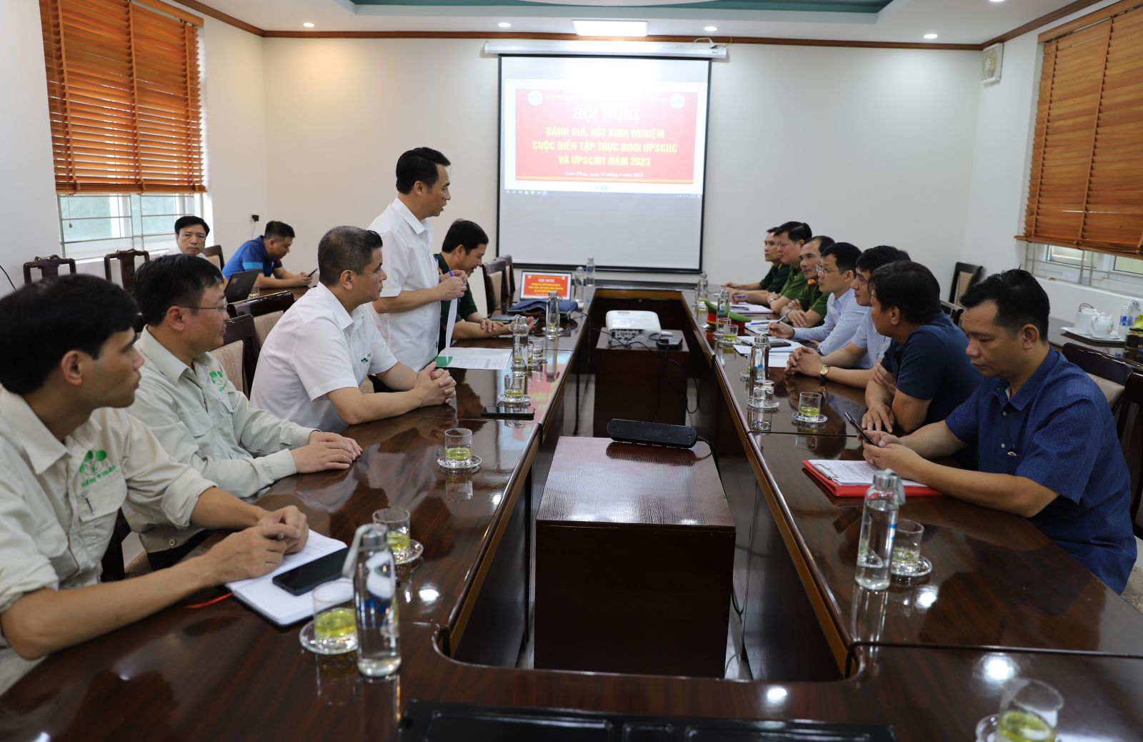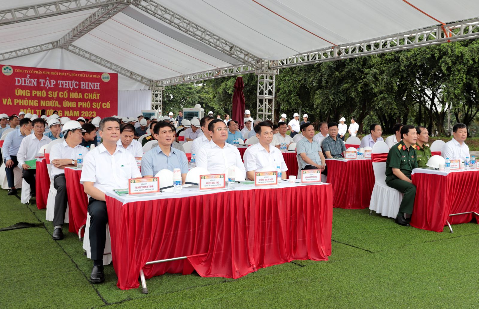 Đến dự và chỉ đạo buổi diễn tập có các đồng chí: Đặng Việt Phương, Phó Giám đốc Sở Công Thương tỉnh Phú Thọ; Nguyễn Bá Thọ, Phó Giám đốc Sở Tài nguyên Môi trường tỉnh Phú Thọ; Phùng Quang Hiệp, Tổng Giám đốc Tập đoàn Hóa chất Việt Nam cùng các đồng chí đại diện Lãnh đạo: Hội đồng trách nhiệm Xã hội các doanh nghiệp Hóa chất Việt Nam VRCC; Tập đoàn Hóa chất Việt Nam; Các Sở, Ban, ngành của tỉnh Phú Thọ; Bộ Chỉ huy quân sự tỉnh Phú Thọ; Phòng Cảnh sát phòng cháy chữa cháy và Cứu nạn cứu hộ Công an tỉnh Phú Thọ; Trung tâm Y tế huyện Lâm Thao; Phòng Tài nguyên Môi trường huyện Lâm Thao; Uỷ ban nhân dân thị trấn Lâm Thao; các Doanh nghiệp thành viên trong Tập đoàn Hóa chất Việt Nam; các Công ty kinh doanh hóa chất trên địa bàn tỉnh Phú Thọ. Về phía Công ty cổ phần Supe Phốt phát và Hoá chất Lâm Thao có đồng chí Phạm Thanh Tùng, Bí thư Đảng uỷ, Tổng Giám đốc Công ty, Trưởng Ban chỉ đạo cuộc diễn tập và các đồng chí trong Ban điều hành Công ty; thủ trưởng các đơn vị trong Công ty; Ban chỉ huy cùng 92 đồng chí tham gia diễn tập; lực lượng phục vụ, hỗ trợ cuộc diễn tập.