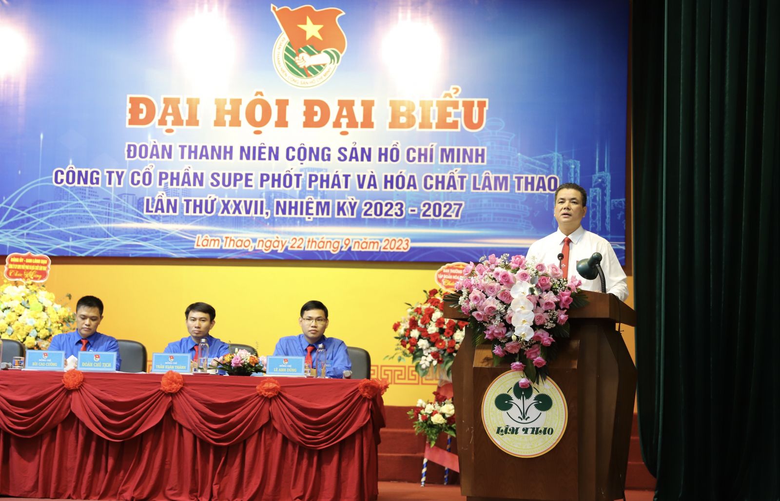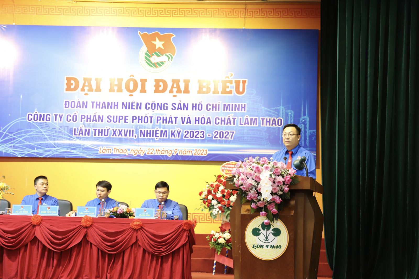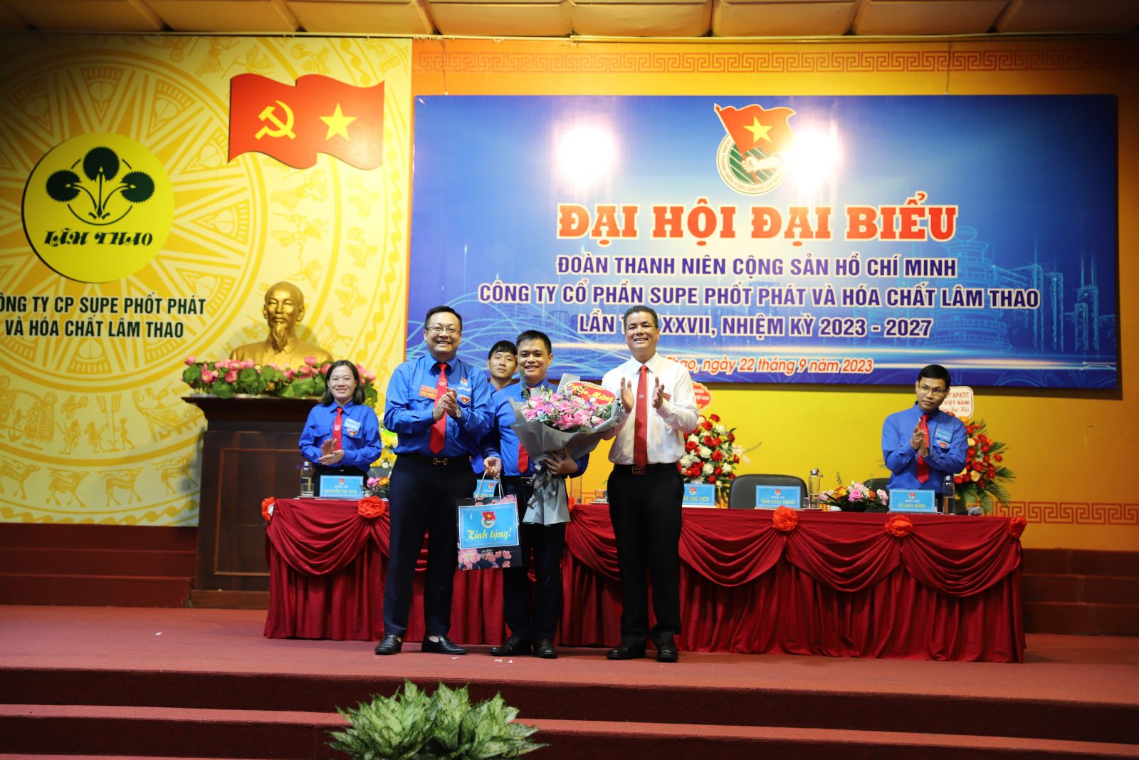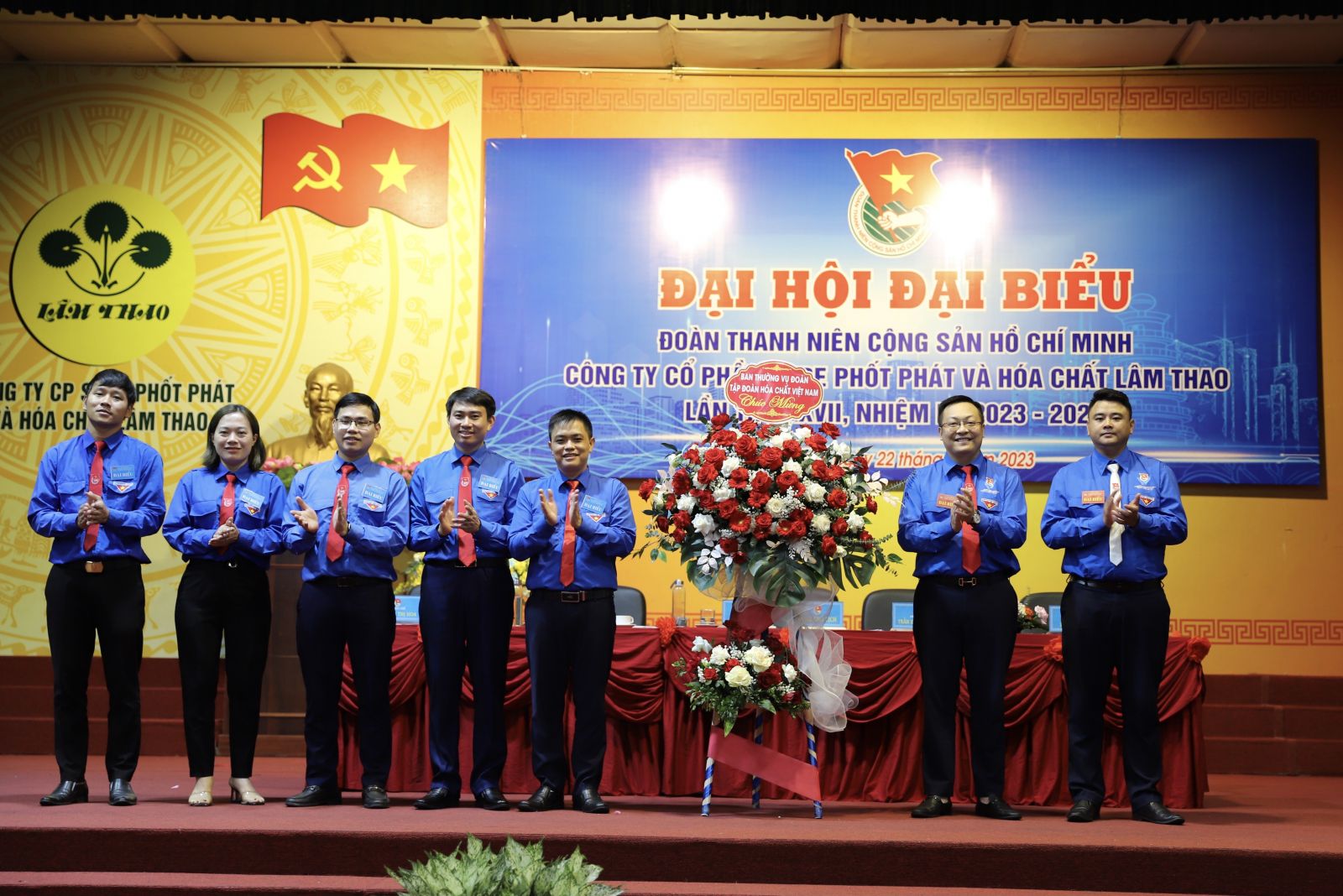 Phát biểu, tặng hoa chúc mừng Đại hội, đồng chí Phạm Thanh Tùng, Bí thư Đảng uỷ, Tổng Giám đốc Công ty và đồng chí Nguyễn Anh Quyền, UV BCH Đảng bộ Tập đoàn, Bí thư Đoàn Thanh niên Tập đoàn ghi nhận và biểu dương kết quả mà ĐVTN đã đạt được trong nhiệm kỳ 2022-2027.
