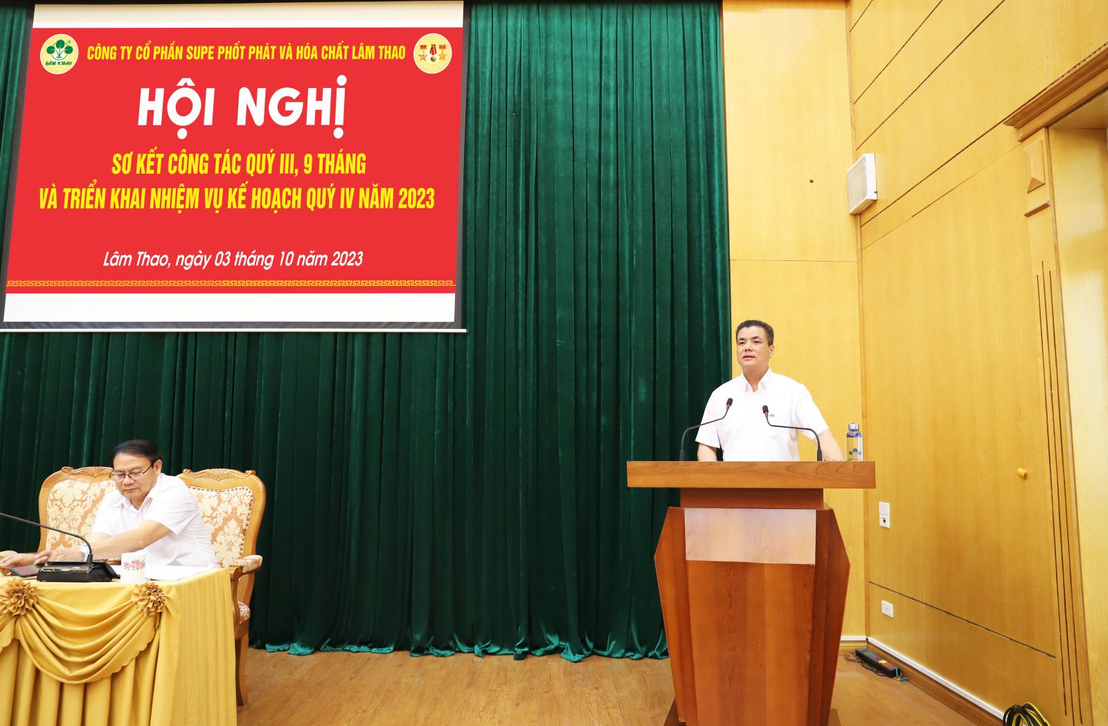 Thay mặt Ban Lãnh đạo Công ty, đồng chí Phạm Thanh Tùng, Bí thư Đảng uỷ, Tổng Giám đốc đã phát biểu ghi nhận, biểu dương và đánh giá cao những cố gắng nỗ lực, đóng góp của người lao động đối với sự phát triển của Công ty trong 9 tháng năm 2023. Nhân dịp này, thừa uỷ quyền của Tổng Giám đốc Tập đoàn Hoá chất Việt Nam, đồng chí Phạm Thanh Tùng đã trao tặng Cờ Thi đua của Tập đoàn Hoá chất Việt Nam cho hai đơn vị trong Công ty (Văn phòng Công ty và Xí nghiệp Supe 2) vì đã có thành tích xuất sắc trong phong trào sản xuất kinh doanh và các công tác khác, góp phần hoàn thành xuất sắc nhiệm vụ của Tập đoàn Hoá chất Việt Nam trong năm 2022. Đồng thời, Tổng Giám đốc Công ty Phạm Thanh Tùng trao tặng Cờ đơn vị dẫn đầu thi đua quý III cho Phòng Y tế, Xí nghiệp Supe 1 và Phòng Tổ chức Lao động. Biểu dương các Xí nghiệp NPK số 2, NPK số 3; Phòng Tài chính Kế toán, phòng Kinh doanh vì đã có thành tích xuất sắc trong phong trào thi đua lao động sản xuất trong quý.
