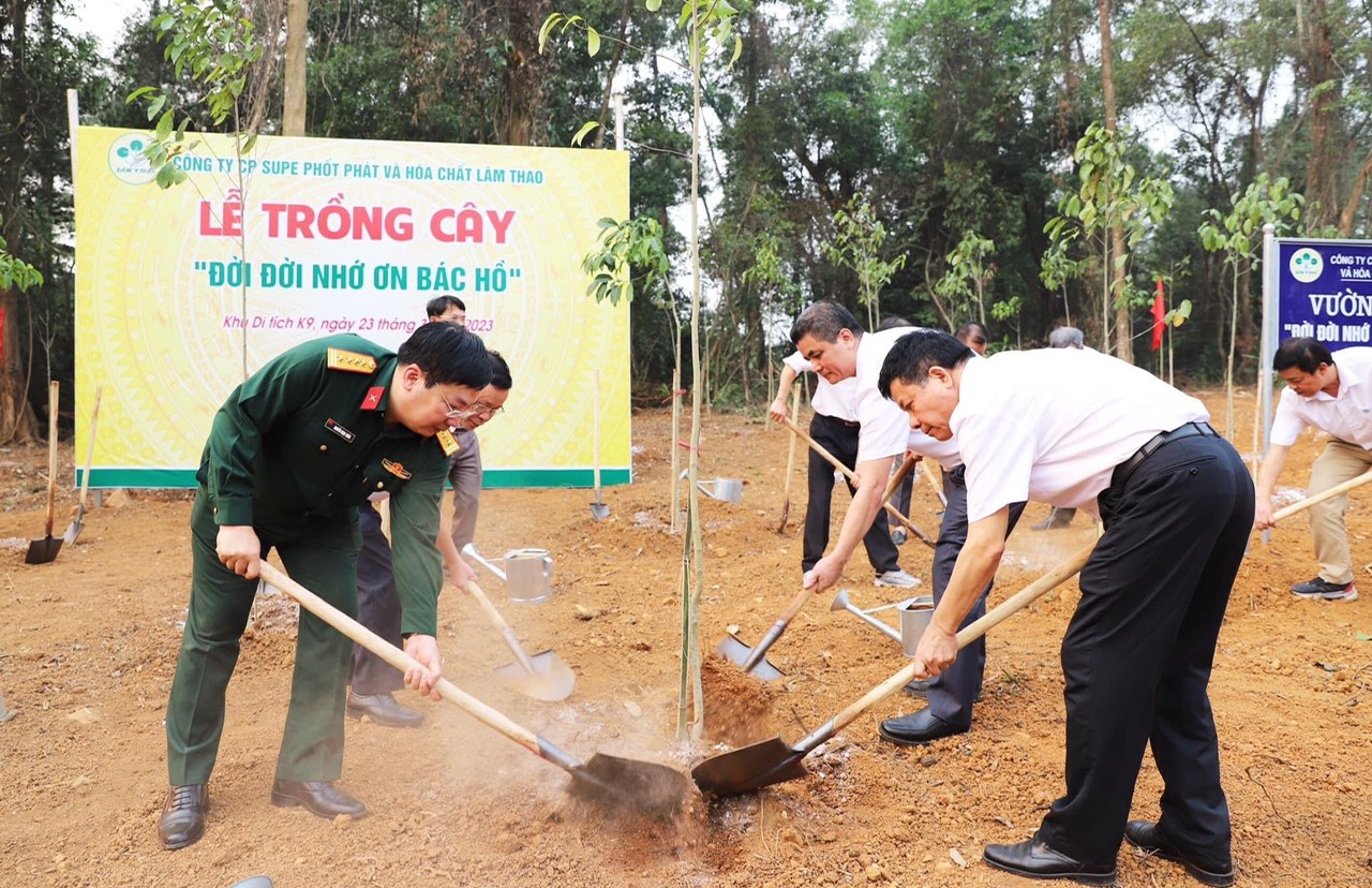 Lãnh đạo Supe Lâm Thao trồng cây trong vườn cây "Đời đời nhớ ơn Bắc Hồ" do Công ty trồng và chăm sóc, tại K9 Đá Chông, Ba Vì, Hà Nội.