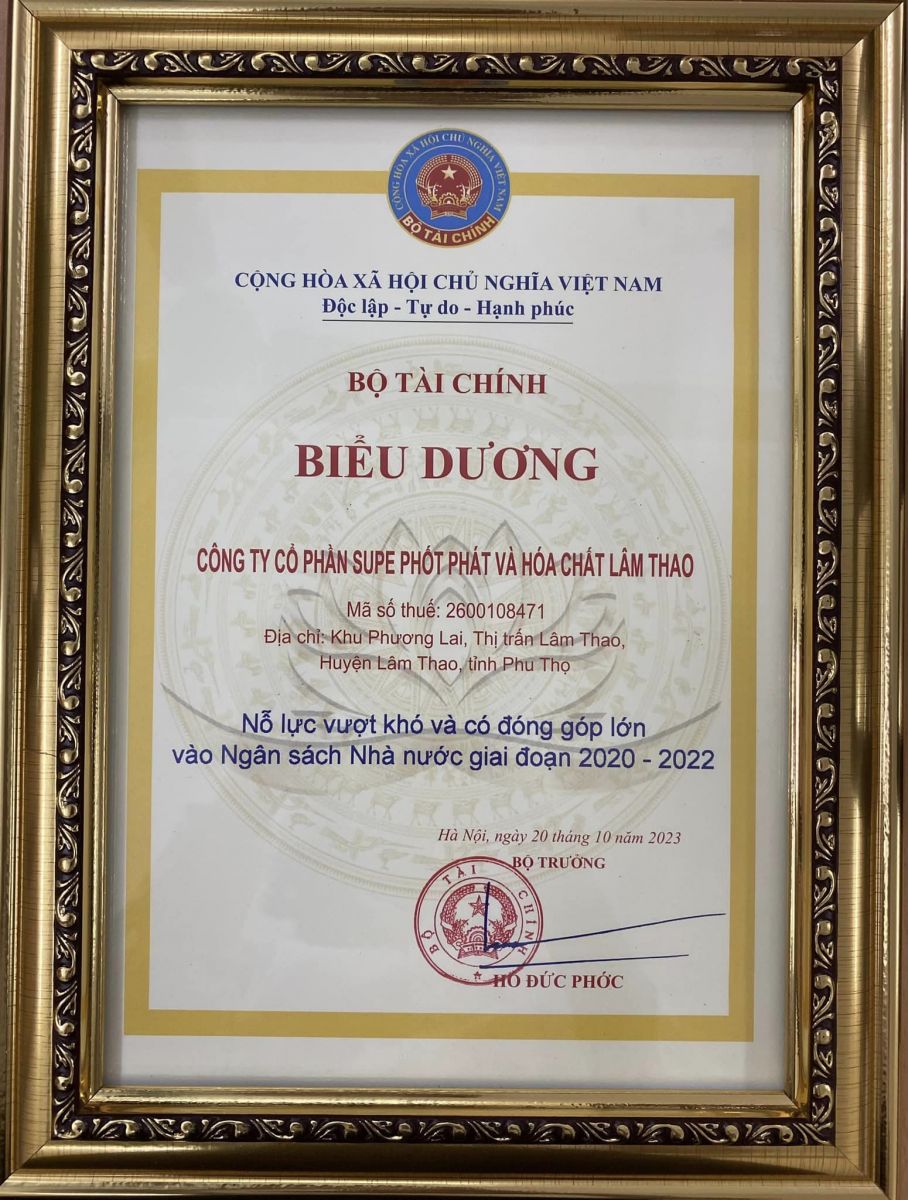 Ngày 20 tháng 10 năm 2023, tại Hà Nội, Bộ Tài chính và Tổng cục Thuế tổ chức tổ chức Hội nghị “Biểu dương người nộp thuế tiêu biểu giai đoạn 2020-2022”. Công ty cổ phần Supe Phốt phát và Hoá chất Lâm Thao vinh dự là một trong 138 đơn vị được vinh danh và là doanh nghiệp duy nhất đại diện cho tỉnh Phú Thọ được biểu dương tại sự kiện này.