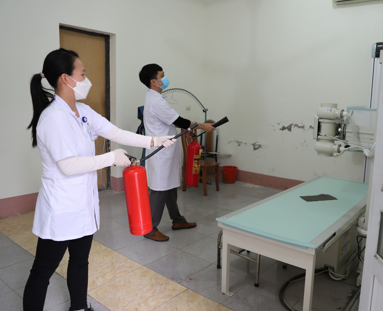 Tại buổi diễn tập, đội PCCC bán chuyên của Phòng Y tế thực hiện hai tình huống giả định: Tình huống 1: Khi phòng đang ở vị trí chụp chiếu, có người lạ xâm nhập vào khu vực làm việc, có khả năng gây nguy hiểm đến sức khỏe. Tình huống 2: Hỏa hoạn tại vị trí máy X-Quang. Khi nhân viên y tế phát hiện đám cháy bởi có khói phát ra từ phòng đặt máy X- Quang, Trưởng Phòng Y tế nhận được thông báo lập tức đến ngay hiện trường và điều động 04 cán bộ y tế đến hiện trường hỗ trợ nhân viên vận hành máy X-Quang tham gia công tác ứng phó sự cố và các hoạt động cứu trợ, cấp cứu người bị nạn. Đồng thời, Trưởng Phòng Y tế gọi điện báo cáo cho Lãnh đạo Công ty và cán bộ phụ trách an toàn bức xạ về sự cố.