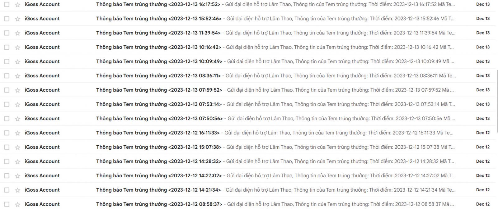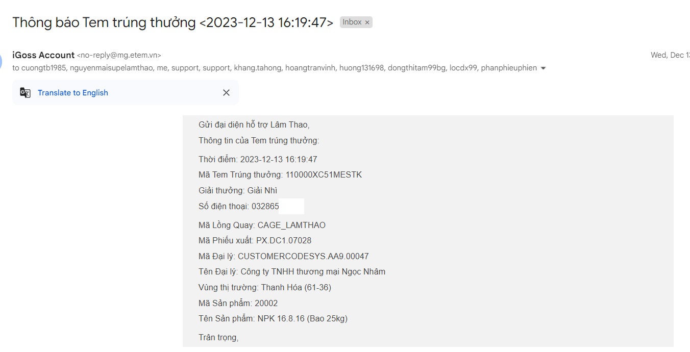 Từ ngày 12/12/2023 đến ngày 21/12/2023 Xin chúc mừng các khách hàng đã trúng thưởng chương trình khuyến mại "Quét QR ngay nhận tiền liền tay" của Công ty Cổ phần Supe phốt phát và Hóa chất Lâm Thao:
