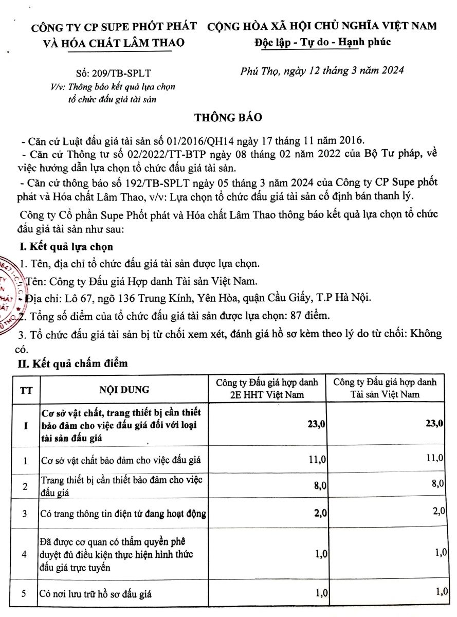 Thông báo về việc lựa chọn tổ chức hành nghề đấu giá tài sản cố định bán thanh lý của Công ty Cổ phần Supe Phốt phát và Hóa chất Lâm Thao