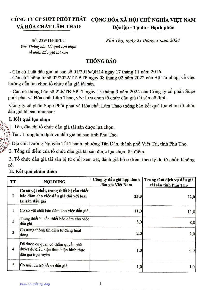 Thông báo về việc lựa chọn tổ chức hành nghề đấu giá tài sản cố định bán thanh lý của Công ty Cổ phần Supe Phốt phát và Hóa chất Lâm Thao