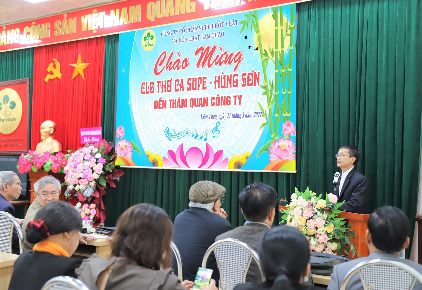 Trong không khí thân mật, thay mặt Lãnh đạo Công ty, đồng chí Lê Văn Hoằng, Chủ tịch Công đoàn Công ty bày tỏ sự vui mừng, phấn khởi, chào đón đoàn CLB Thơ ca Supe – Hùng Sơn đã đến thăm Công ty. Tại buổi gặp mặt, đồng chí Chủ tịch Công đoàn Công ty giới thiệu về quá trình xây dựng, phát triển và những thành tựu mà Công ty đạt được trong 62 năm qua.