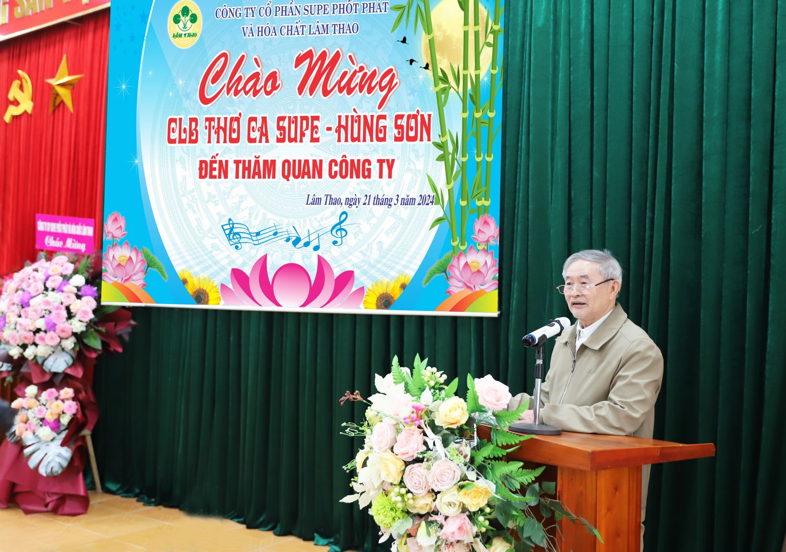 Phát biểu tại buổi gặp mặt, bác Lê Hoàng Nền, Chủ nhiệm CLB Thơ ca Supe – Hùng Sơn trân trọng cảm ơn những tình cảm đón tiếp trọng thị của Ban Lãnh đạo và người lao động Công ty. Nhân dịp này, thay mặt cho đoàn CLB Thơ ca Supe – Hùng Sơn chúc Công ty ngày càng phát triển và bền vững trong những năm tiếp theo.