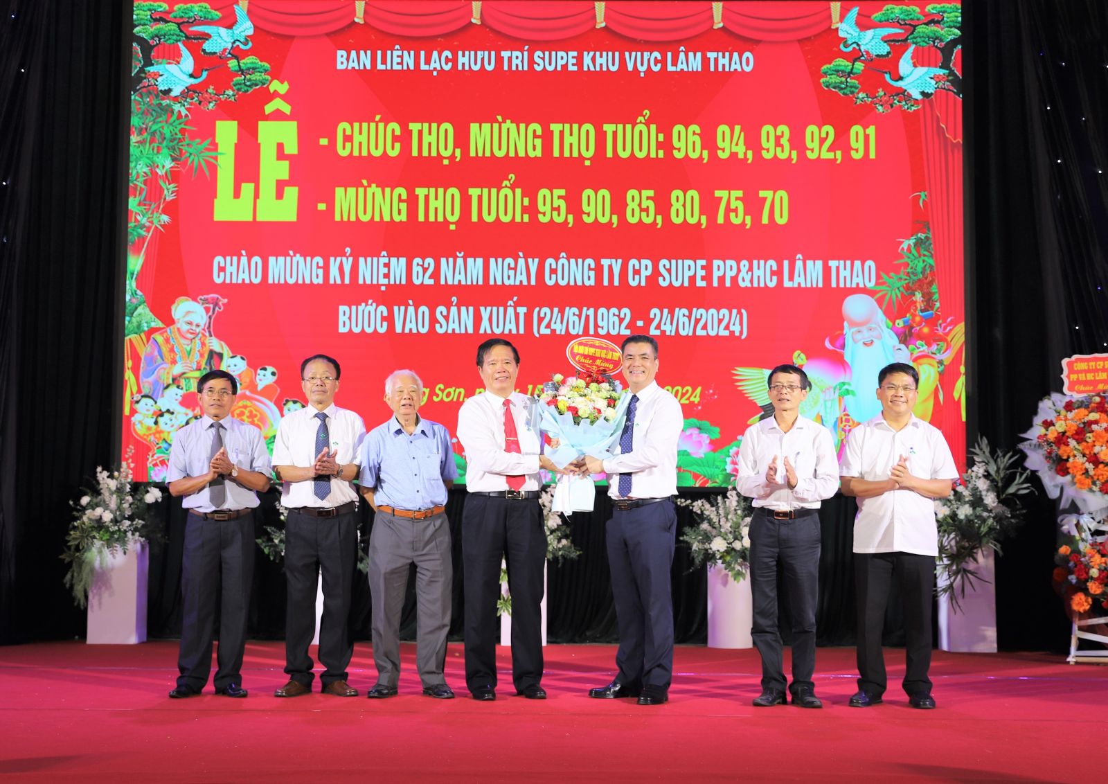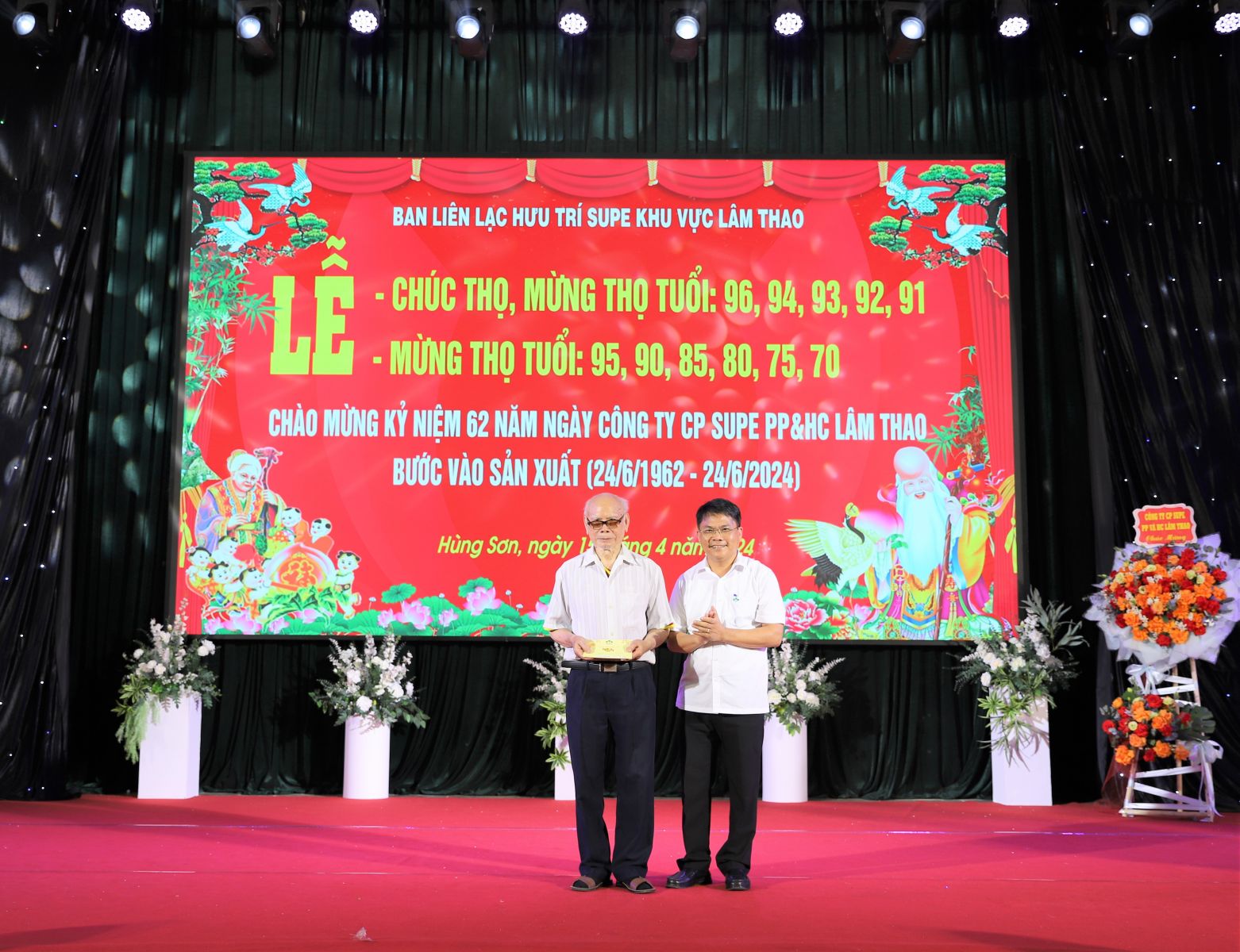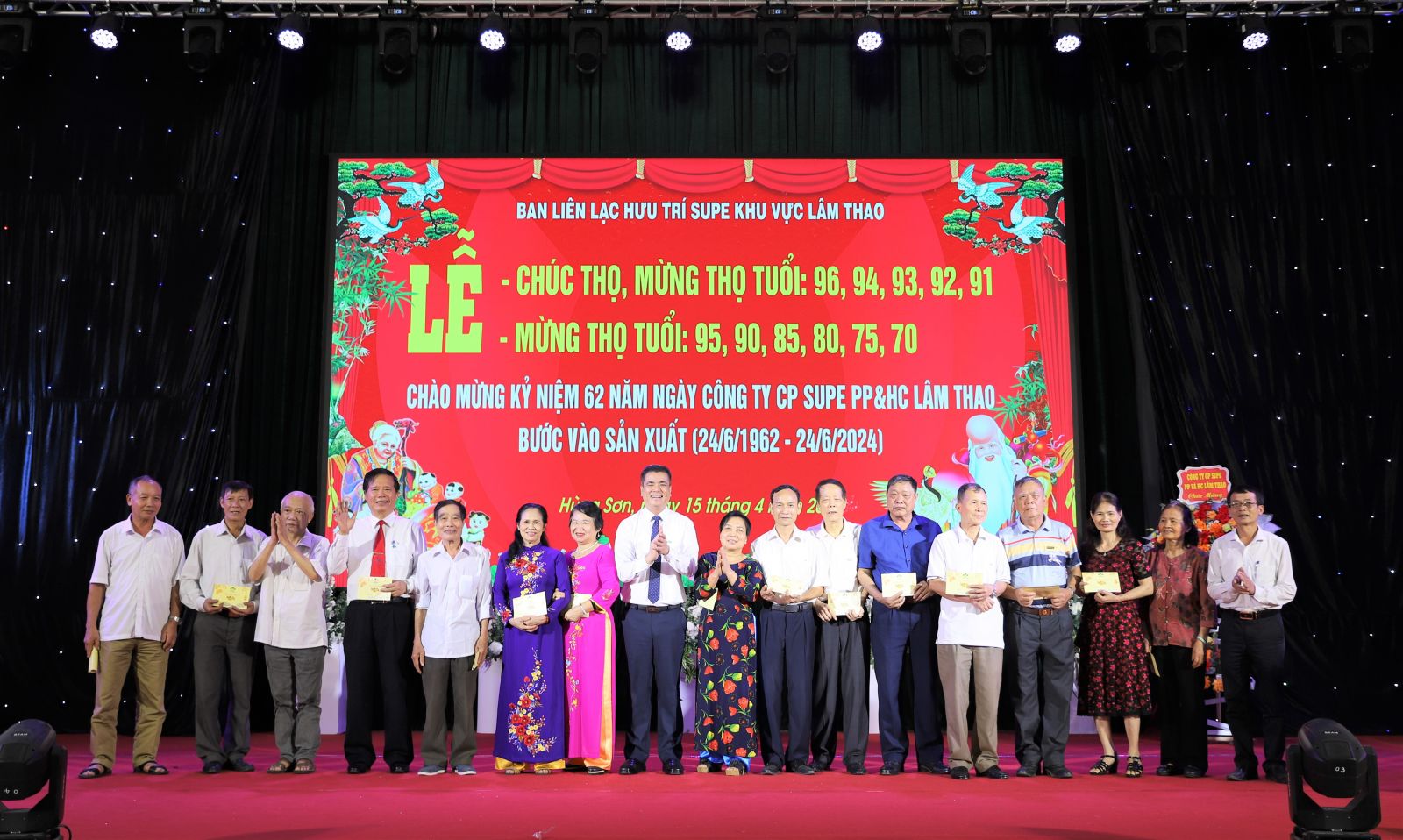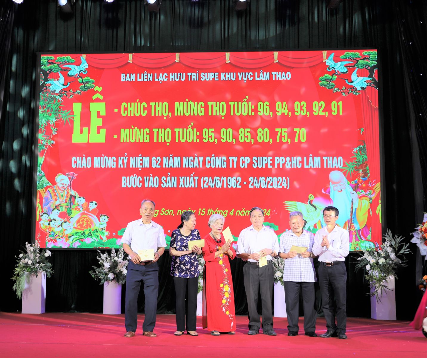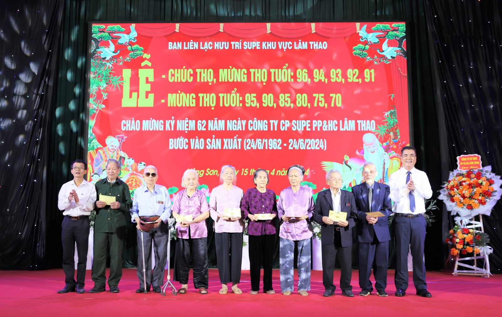 Tại buổi lễ, đại diện Lãnh đạo Công ty và Hội hưu trí Supe khu vực Lâm Thao đã tổ chức chúc thọ cho các cụ tuổi 96, 94, 93, 92, 91 và mừng thọ cho các cụ tuổi 95, 90, 85, 80, 75, 70.