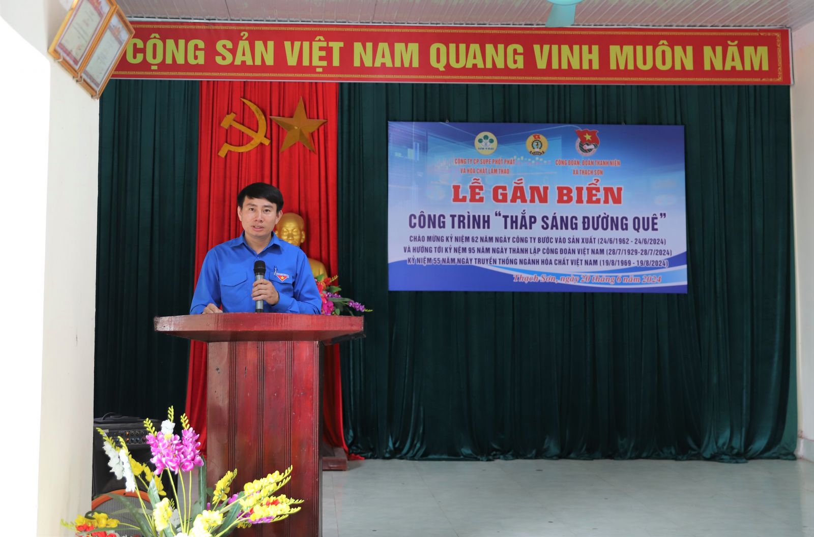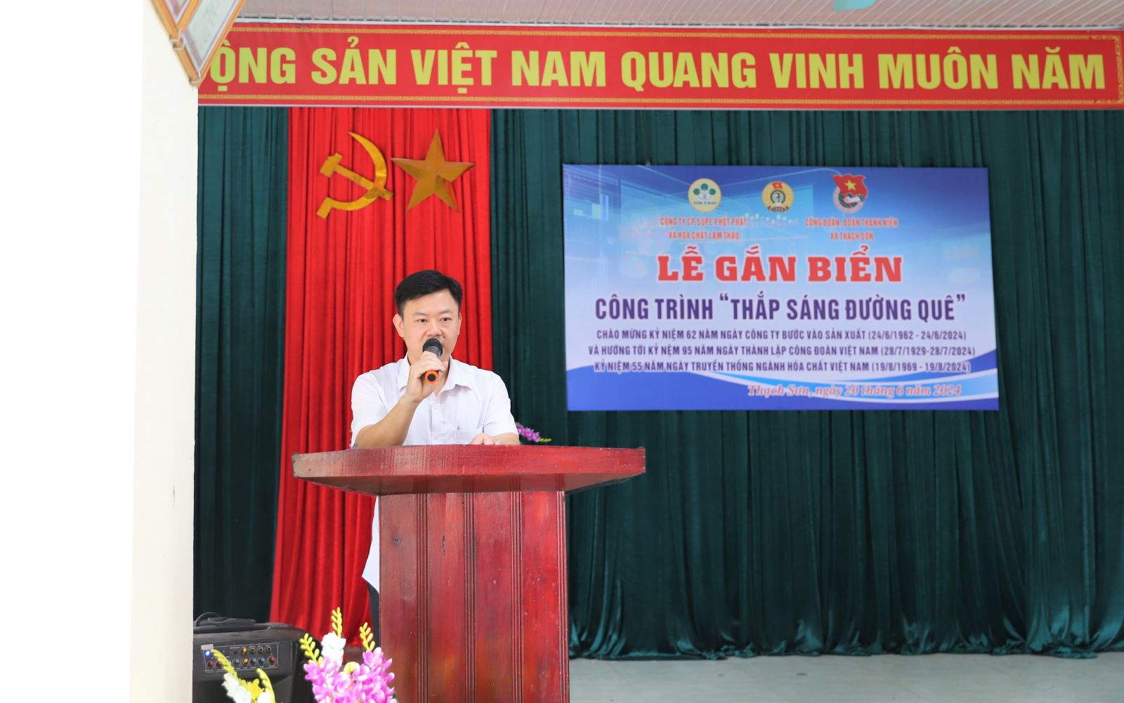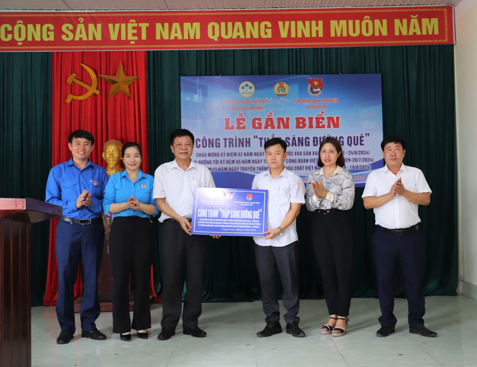 Thiết thực hướng tới chào mừng kỷ niệm 62 năm ngày Công ty cổ phần Supe Phốt phát và Hóa chất Lâm Thao bước vào sản xuất (24/6/1962-24/6/2024) và 95 năm ngày thành lập Công đoàn Việt Nam (28/7/1929-28/7/2024), 55 năm ngày truyền thống ngành Hóa chất Việt Nam (19/8/1969-19/8/2024), sáng ngày 20 tháng 6 năm 2024, Đoàn Thanh niên Công ty phối hợp với Đoàn Thanh niên xã Thạch Sơn và thị trấn Hùng Sơn (Lâm Thao, Phú Thọ) tổ chức Lễ gắn biển Công trình: "Thắp sáng đường quê" năm 2024 tại xóm Hóc Thầy, khu 3, xã Thạch Sơn và Công trình "Điểm vui chơi" tại nhà văn hóa khu 3, thị trấn Hùng Sơn.