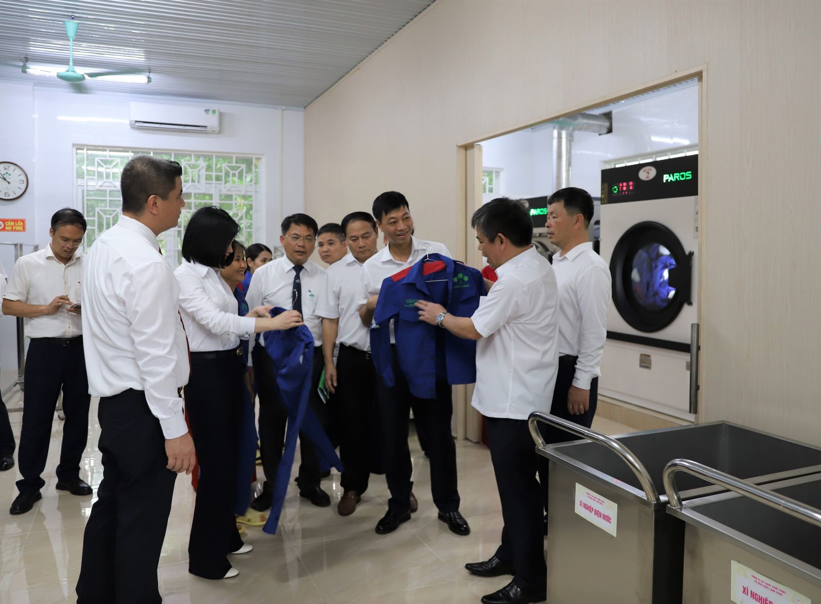 Đối với công trình "Phòng giặt quần áo bảo hộ lao động cho người lao động” được khởi công ngày 25/12/2023 và hoàn thành vào ngày 19/3/2024. Công ty đã xây dựng mới phòng giặt quần áo, đầu tư hệ thống máy giặt, máy sấy và các trang thiết bị hiện đại với tổng giá trị 4,1 tỷ đồng. Hệ thống gồm 03 máy giặt có công suất 50kg/mẻ/01 máy và 03 máy sấy có công suất 55kg/mẻ/01 máy. Trong 01 ca sản xuất, nếu vận hành cả 3 máy giặt và 3 máy sấy sẽ xử lý được 1.500 bộ quần áo bảo hộ lao động với hình thức tổ chức: Giặt, sấy quần áo tập trung tại Xí nghiệp Đời sống. Các đơn vị có trách nhiệm cử người của đơn vị mình mang quần áo bảo hộ lao động chưa giặt đến giao cho Xí nghiệp Đời sống để thực hiện việc giặt, sấy. Sau khi Xí nghiệp Đời sống thực hiện giặt, sấy xong, các đơn vị cử người đến nhận lại quần áo đã giặt, sấy về đơn vị trả cho người lao động sử dụng.