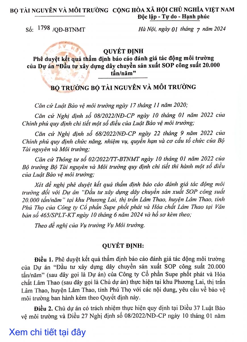 Kết quả thẩm định báo cáo đầu tư xây dựng dây chuyền sản xuất SOP công suất 20.000 tấn/năm