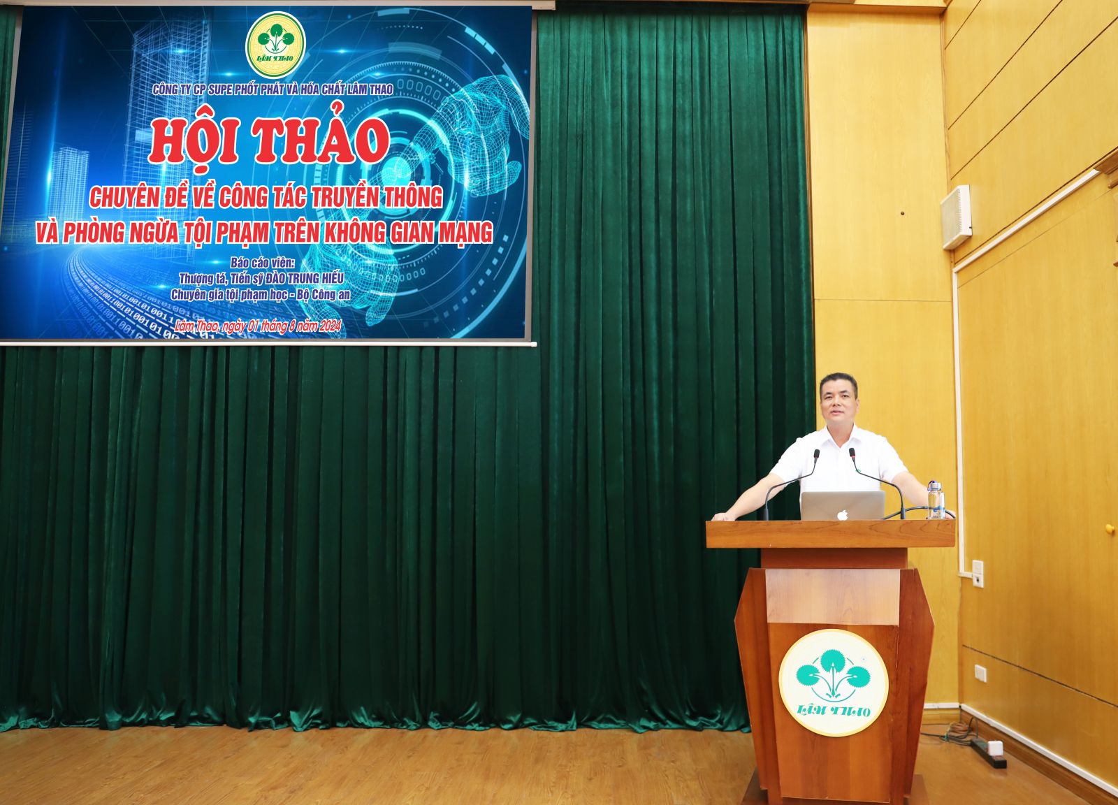 Nhằm không ngừng trang bị những kiến thức, kinh nghiệm trong lĩnh vực truyền thông và phòng ngừa tội phạm trên không gian mạng cho tập thể Ban lãnh đạo, cán bộ chủ chốt và các đơn vị phòng ban chuyên môn, sáng ngày 01 tháng 8 năm 2024, Công ty cổ phần Supe Phốt phát và Hoá chất Lâm Thao tổ chức Hội thảo chuyên đề về công tác truyền thông và phòng ngừa tội phạm trên không gian mạng.