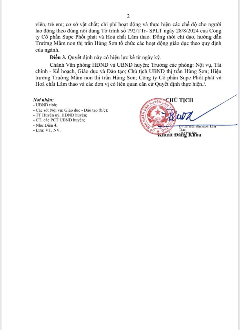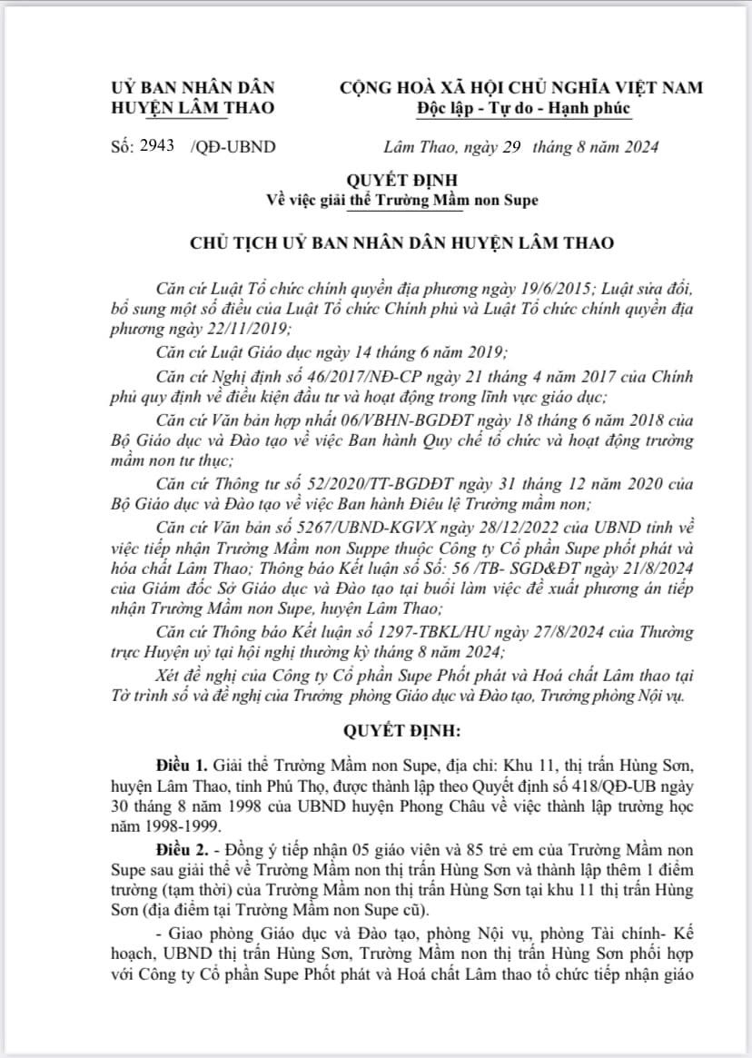 Thực hiện chủ trương của tỉnh Phú Thọ, huyện Lâm Thao và Tập đoàn Hoá chất Việt Nam về việc thống nhất quản lý giáo dục mầm non (Quản lý theo ngành dọc: Sở Giáo dục và Đào tạo; phòng Giáo dục và Đào tạo) nhằm phát huy toàn diện công tác chăm sóc và giáo dục trẻ mầm non trên địa bàn, ngày 29 tháng 8 năm 2024, Uỷ ban nhân dân huyện Lâm Thao ban hành Quyết định số 2943/QĐ-UBND về việc Trường Mầm non Supe chính thức được sáp nhập vào Trường Mầm non thị trấn Hùng Sơn (Lâm Thao, Phú Thọ).