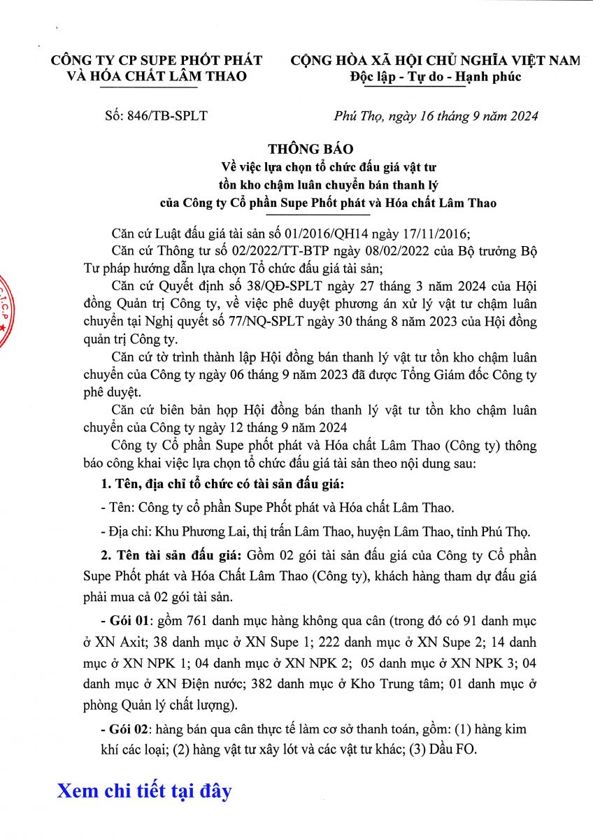 Thông báo về việc lựa chọn tổ chức hành nghề đấu giá tài sản cố định bán thanh lý của Công ty Cổ phần Supe Phốt phát và Hóa chất Lâm Thao