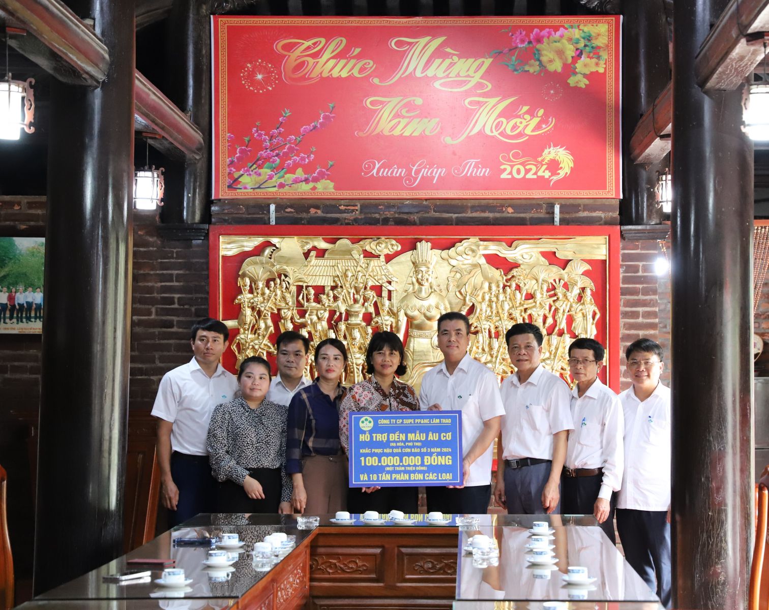 Được biết, do ảnh hưởng của cơn bão số 3, gây ngập lụt tại Khu Di tích Đền Mẫu Âu cơ, làm thiệt hại nghiêm trọng về cơ sở vật chất và vườn cây lưu niệm. Nhân dịp này, thay mặt Lãnh đạo Công ty, đồng chí Tổng Giám đốc Phạm Thanh Tùng đã trao số tiền 100 triệu đồng cùng 10 tấn phân bón Lâm Thao hỗ trợ Khu Di tích. Đồng chí Tổng Giám đốc Công ty chia sẻ với những khó khăn, thiệt hại về mọi mặt của Khu Di tích Đền Mẫu Âu cơ, đồng thời mong muốn với sự hỗ trợ của Công ty sẽ góp phần cùng Ban Quản lý Khu Di tích nhanh chóng khắc phục những hậu quả nặng nề do bão gây ra và chăm sóc vườn cây sớm trở lại phát triển tươi tốt, tạo cảnh quan môi trường xanh mát.