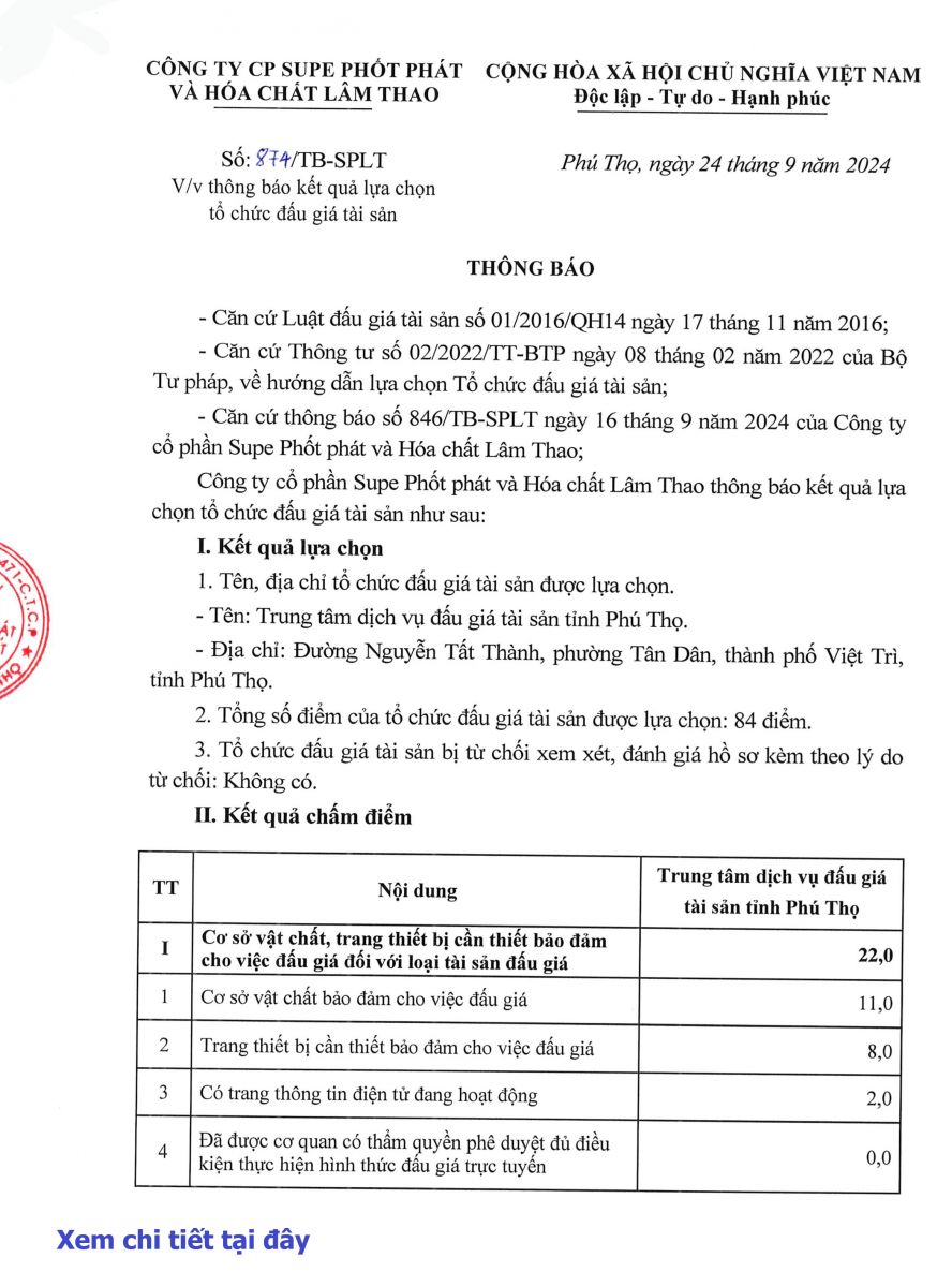 Thông báo về việc lựa chọn tổ chức hành nghề đấu giá tài sản cố định bán thanh lý của Công ty Cổ phần Supe Phốt phát và Hóa chất Lâm Thao