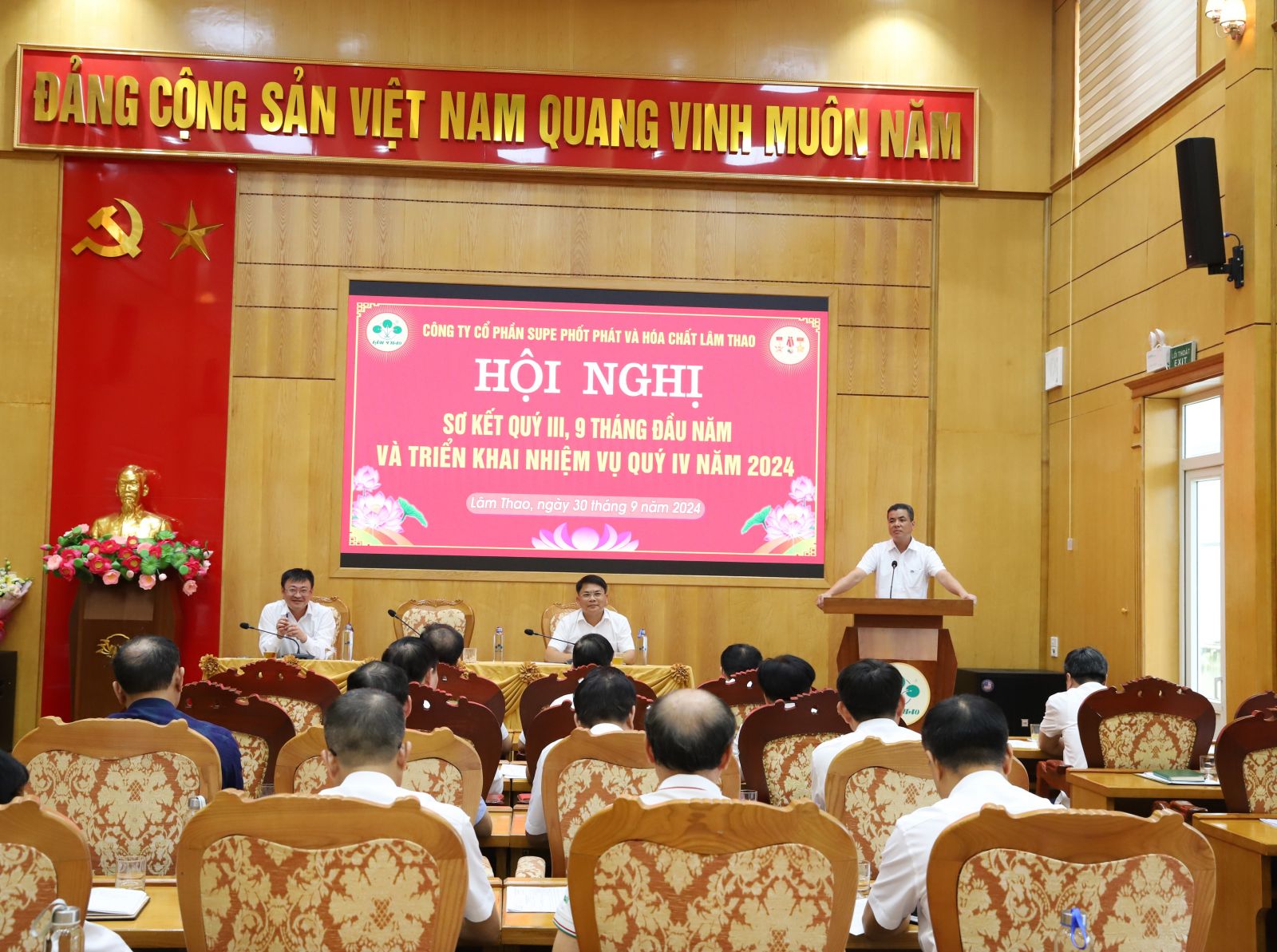 Ngày 30 tháng 9 năm 2024, Công ty cổ phần Supe Phốt phát và Hoá chất Lâm Thao tổ chức Hội nghị sơ kết quý III, 9 tháng đầu năm và triển khai nhiệm vụ quý IV năm 2024, đồng chí Phạm Thanh Tùng, Bí thư Đảng uỷ, Tổng Giám đốc Công ty chủ trì Hội nghị. Cùng dự có các đồng chí trong Ban điều hành Công ty; đại diện các tổ chức đoàn thể và thủ trưởng các đơn vị trong Công ty.