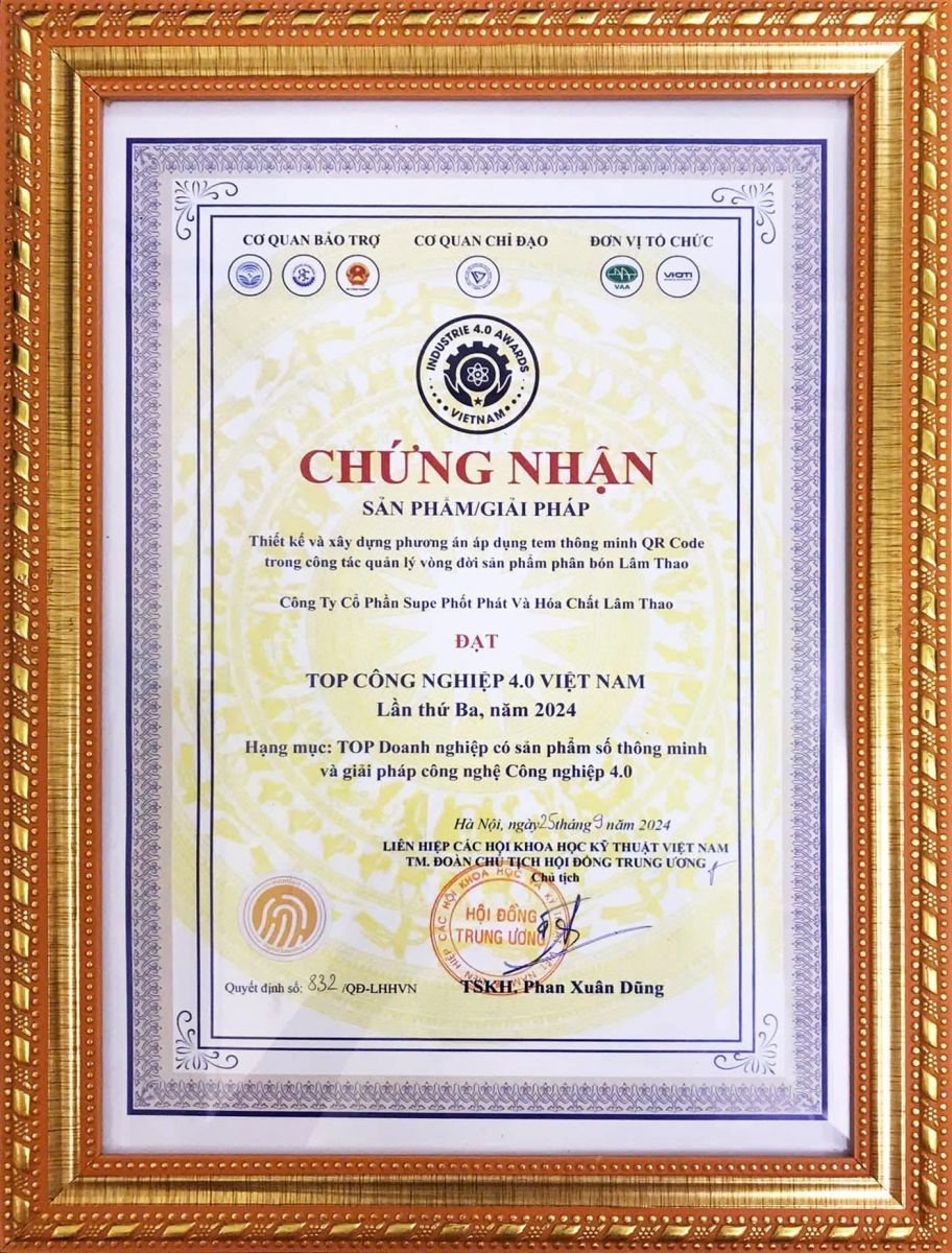 Mới đây, tại Lễ biểu dương “TOP Công nghiệp 4.0 Việt Nam - I4.0 Awards” lần thứ 3 năm 2024 do Viện Sáng tạo và Chuyển đổi số thuộc Liên hiệp Các hội khoa học và kỹ thuật Việt Nam (VUSTA) phối hợp với Hội Tự động hóa Việt Nam tổ chức tại Hà Nội, Công ty cổ phần Supe Phốt phát và Hoá chất Lâm Thao được vinh danh “TOP Công nghiệp 4.0 Việt Nam - I4.0 Awards” lần thứ 3 năm 2024. Thay mặt Lãnh đạo Công ty, đồng chí Trần Đại Nghĩa, Phó Tổng Giám đốc Công ty đón nhận danh hiệu tại chương trình.