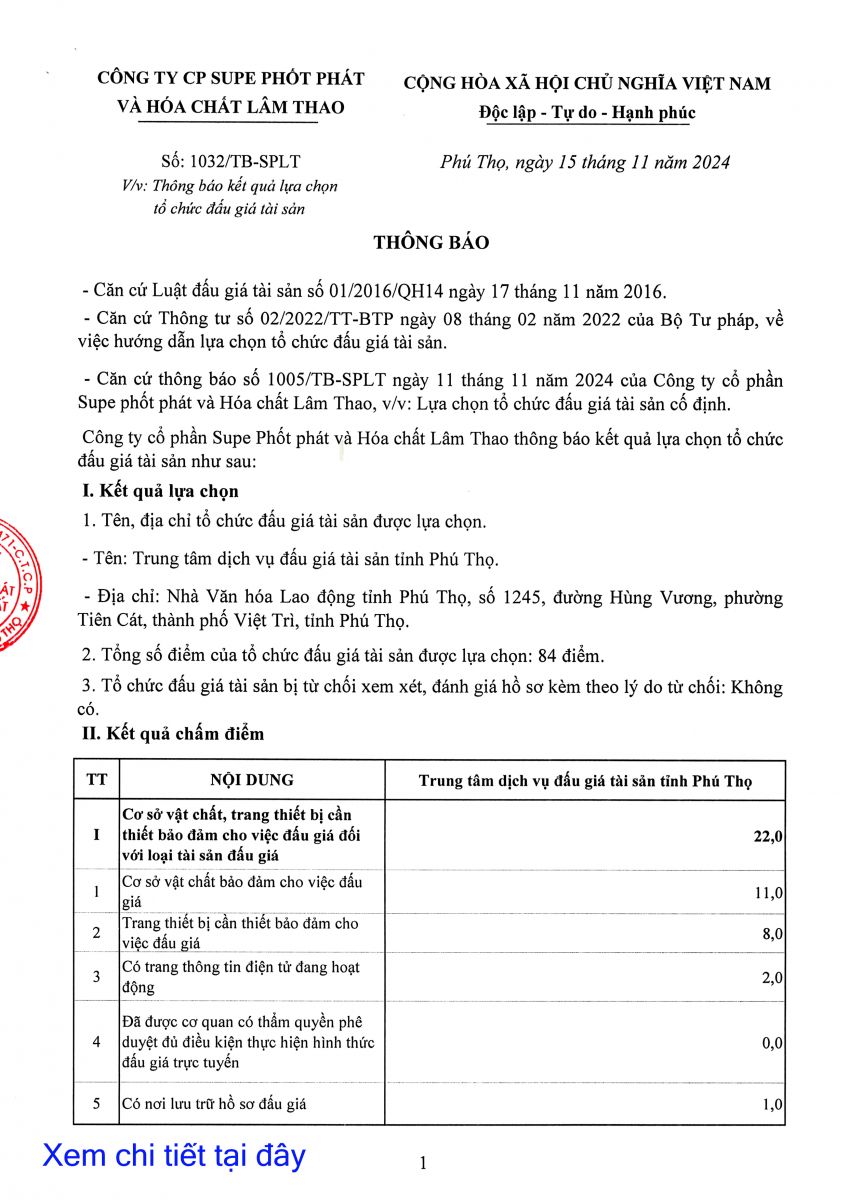 Thông báo về việc lựa chọn tổ chức hành nghề đấu giá tài sản cố định bán thanh lý của Công ty Cổ phần Supe Phốt phát và Hóa chất Lâm Thao