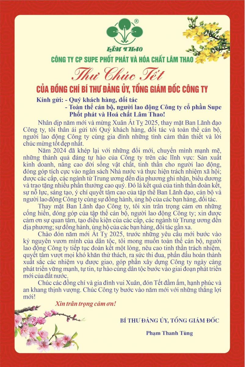 Đón chào năm mới Ất Tỵ 2025, Trang tin Supe Lâm Thao trân trọng giới thiệu toàn văn Thư chúc Tết của đồng chí Phạm Thanh Tùng, Bí thư Đảng uỷ, Tổng Giám đốc Công ty cổ phần Supe Phốt Phát và Hoá chất Lâm Thao.