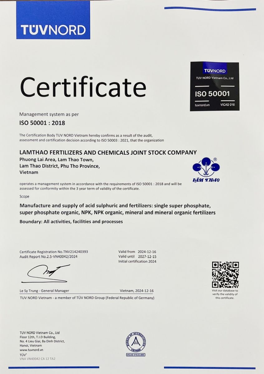 Chứng nhận hệ thống quản lý năng lượng phù hợp tiêu chuẩn ISO 50001:2018 của Supe Lâm Thao.