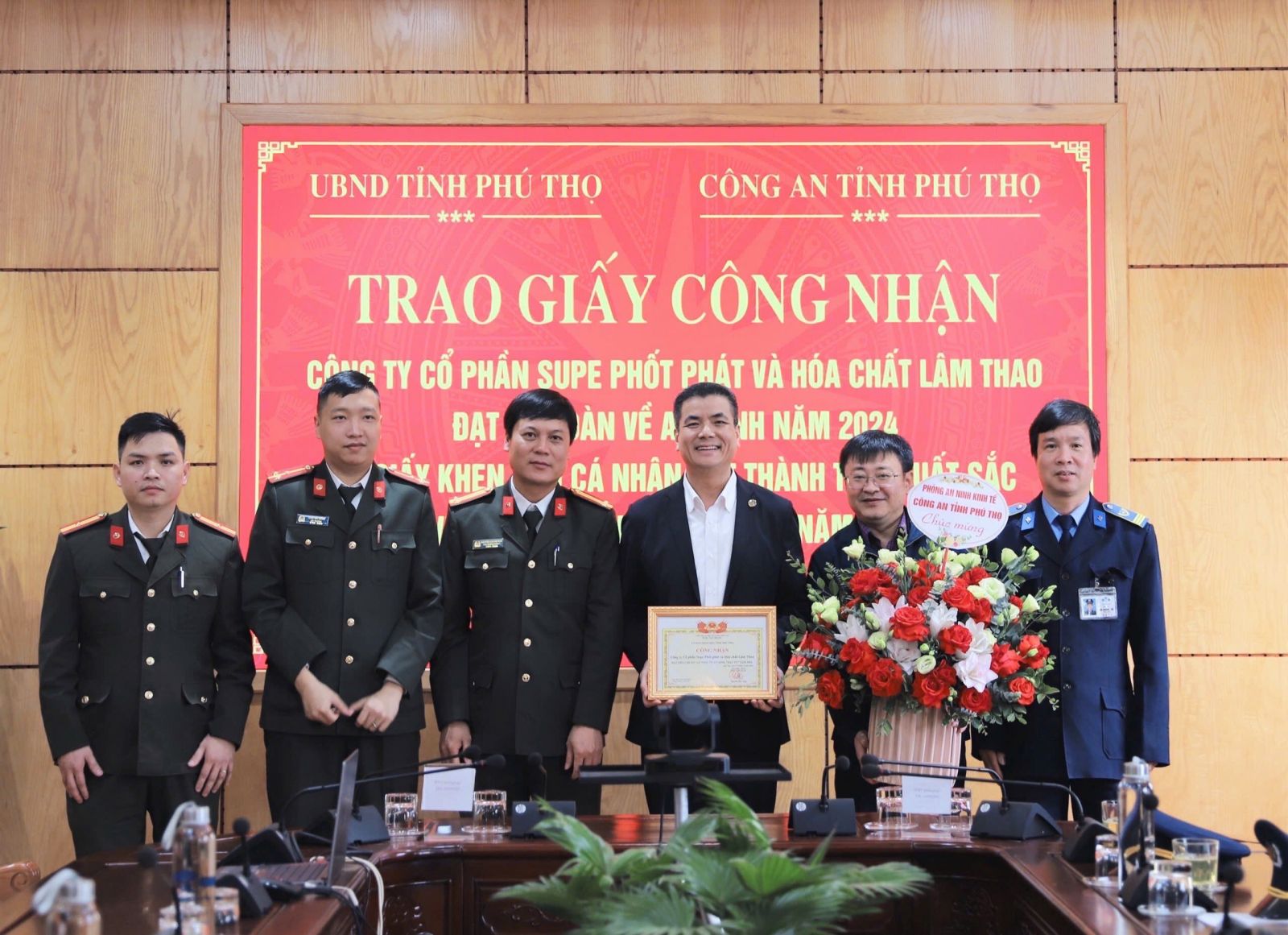 Nhân dịp này, đồng chí Trung tá Nguyễn Hoàng Nam, Phó Trưởng phòng An ninh kinh tế, Công an tỉnh Phú Thọ thừa ủy quyền trao Giấy công nhận Công ty cổ phần Supe Phốt phát và Hóa chất Lâm Thao đạt tiêu chuẩn “An toàn về an ninh, trật tự” năm 2024 của Ủy ban nhân dân tỉnh Phú Thọ.