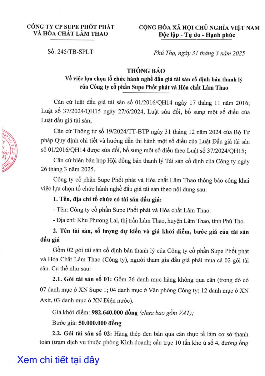 Thông báo về việc lựa chọn tổ chức hành nghề đấu giá tài sản cố định bán thanh lý của Công ty Cổ phần Supe Phốt phát và Hóa chất Lâm Thao