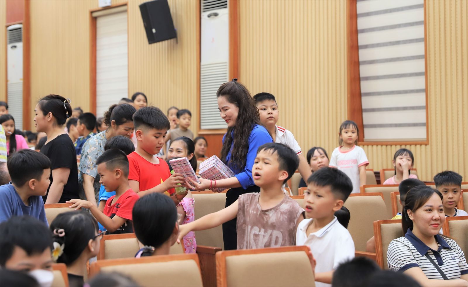 Các đại biểu tặng quà cho đại diện thiếu niên nhi đồng là con em cán bộ người lao động và nhân dân trên địa bàn.