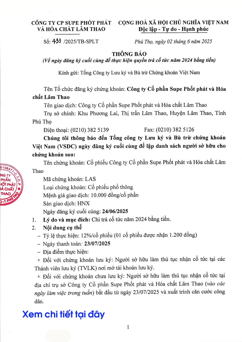 Trang chủ > LAS: Chi trả cổ tức năm 2024 bằng tiền