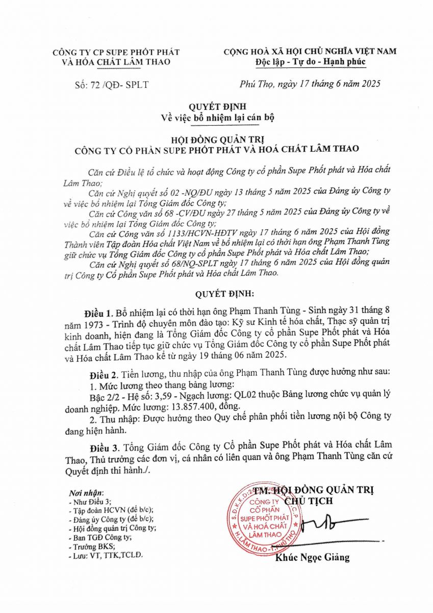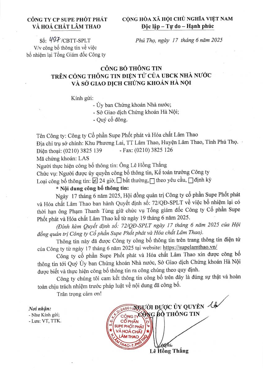 LAS: Công bố thông tin về quyết định bổ nhiệm lại Tổng Giám đốc Công ty