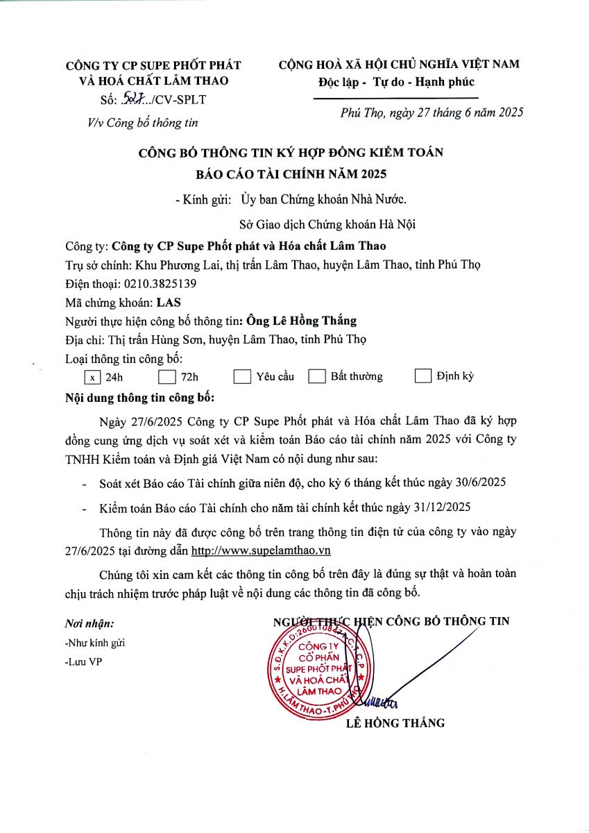 LAS: Công bố thông tin ký hợp đồng kiểm toán Báo cáo tài chính năm 2025