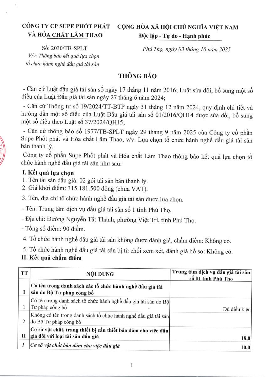 Thông báo về việc lựa chọn tổ chức hành nghề đấu giá tài sản cố định bán thanh lý của Công ty Cổ phần Supe Phốt phát và Hóa chất Lâm Thao