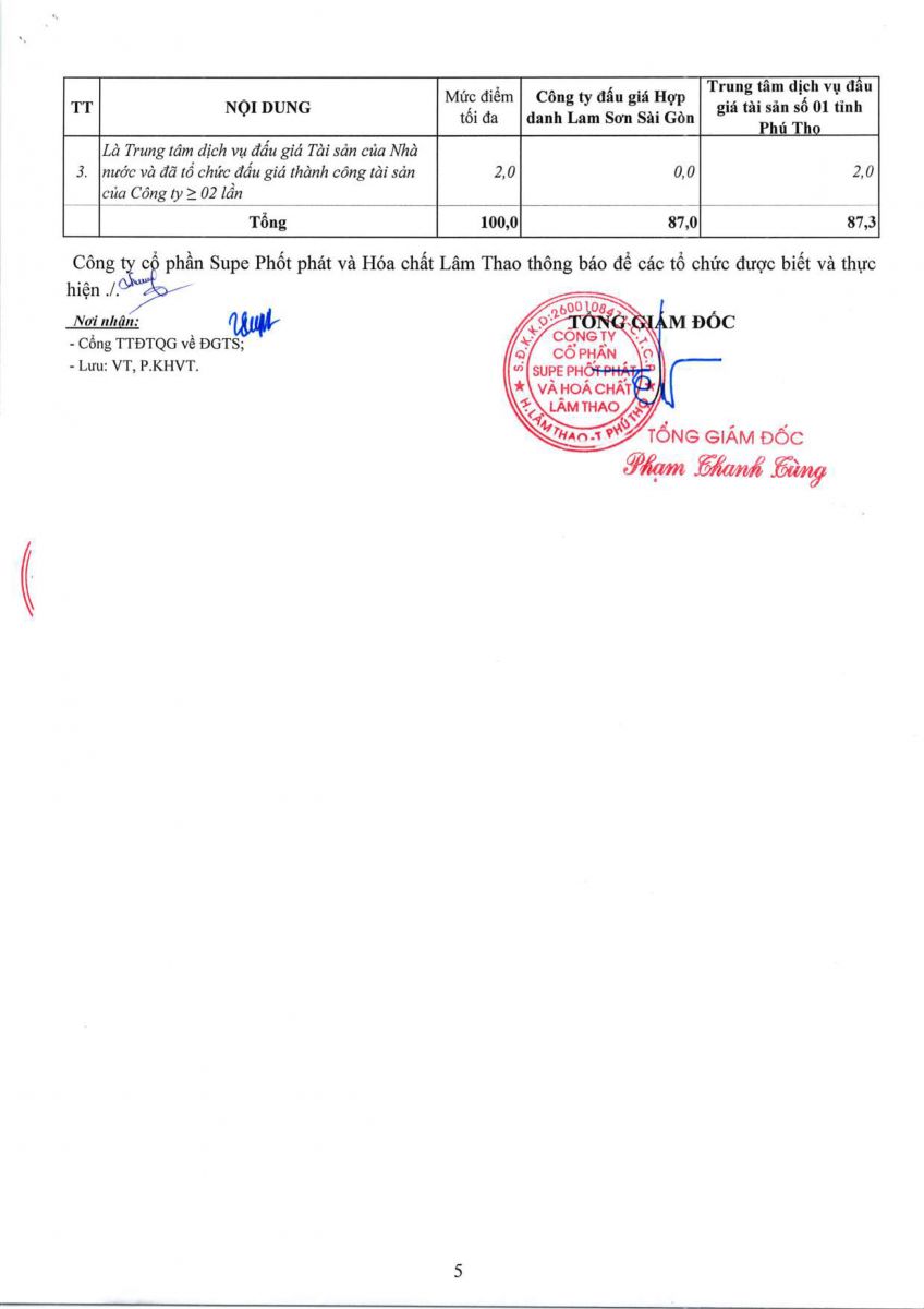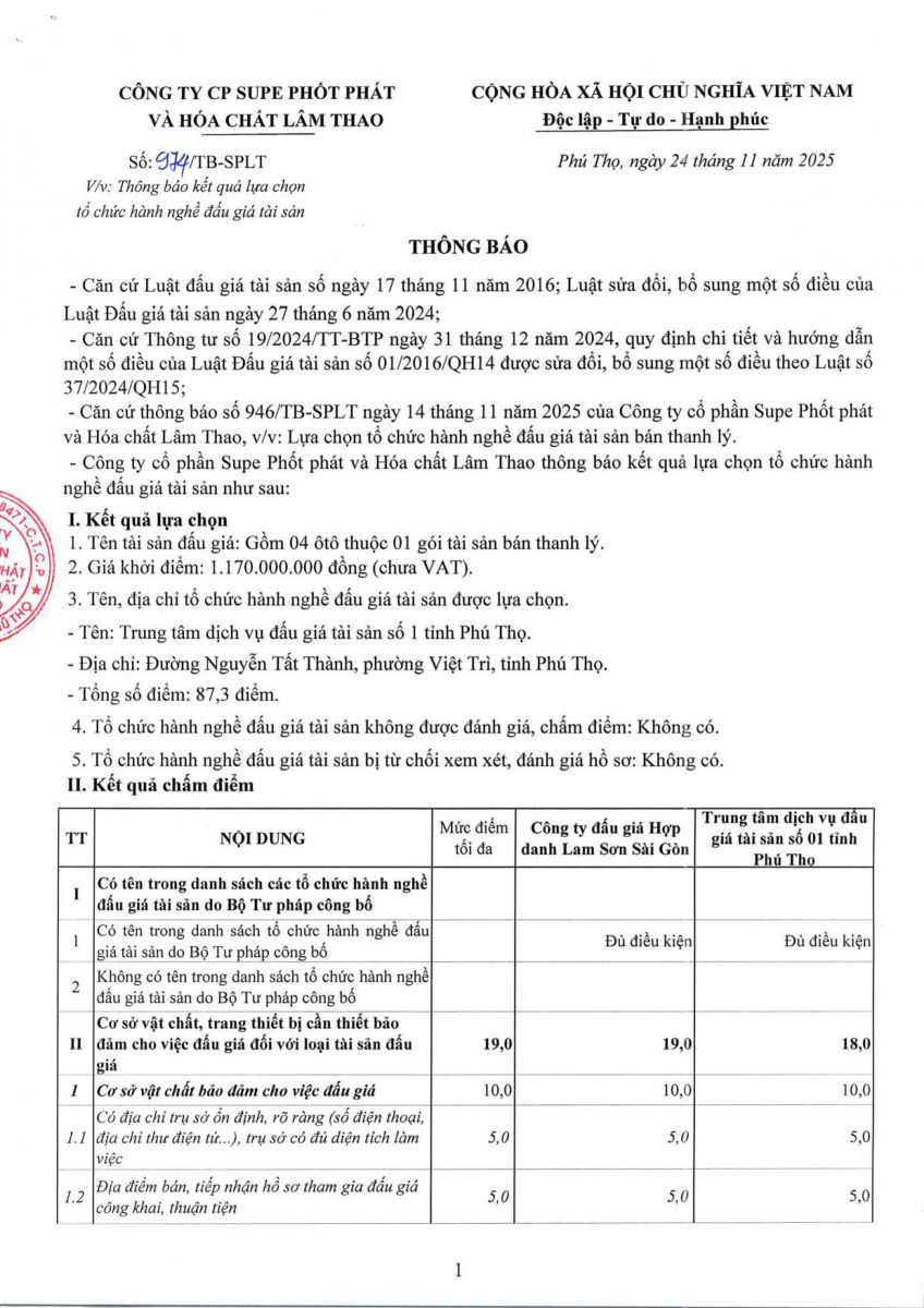 Thống báo về việc lựa chọn tổ chức hành nghề đấu giá tài sản bán thanh lý của Công ty Cổ phần Supe Phốt phát và Hóa chất Lâm Thao