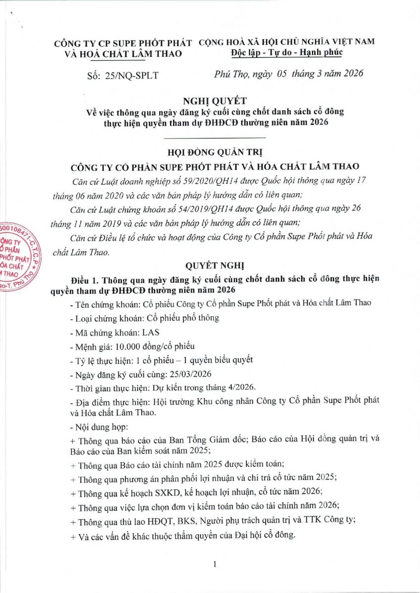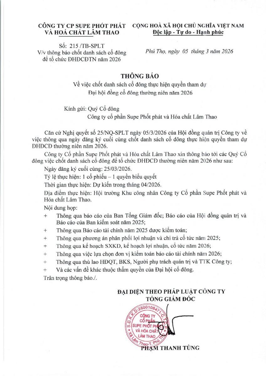 Thông báo ngày đăng ký cuối cùng chốt danh sách cổ đông thực hiện quyền tham dự ĐHĐCĐ thường niên năm 2026