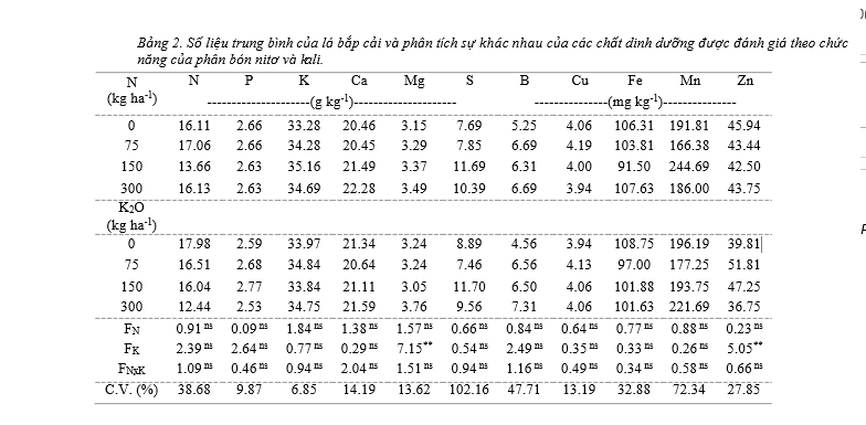 Không có sự tương tác giữa các yếu tố (bón phân N và K) đối với bất kỳ biến nào được đánh giá trong nghiên cứu này. Việc đánh giá tình trạng dinh dưỡng của lá bắp cải chỉ ra rằng các yếu tố không ảnh hưởng đến hàm lượng các chất dinh dưỡng. Trừ Mg và Zn và chỉ bón K (Bảng 2).