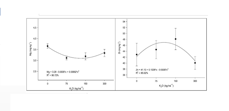 Mg và Zn phản ứng thích hợp với mô hình đa thức bậc hai phản ứng với liều lượng K2O (Hình 1). Hàm lượng Mg thấp nhất quan sát được trong lá bắp cải là với liều lượng 88 kg ha-1 K2O, từ đó hàm lượng Mg trong lá tăng lên. Ứng dụng K được công nhận bằng cách ức chế cạnh tranh sự hấp thụ của Mg [14]. Điều này không được quan sát thấy trong nghiên cứu hiện tại, nơi chỉ quan sát thấy mức giảm ban đầu trong mức Mg. Tuy nhiên, mức độ Zn trên lá sẽ giảm sau một lượng K2O nhất định; Zn được cây hấp thụ dưới dạng Zn2 +, và trong trường hợp vi chất dinh dưỡng cation này, liều lượng trên 132,8 kg ha-1 làm giảm mạnh mức độ lá Zn trong bắp cải.